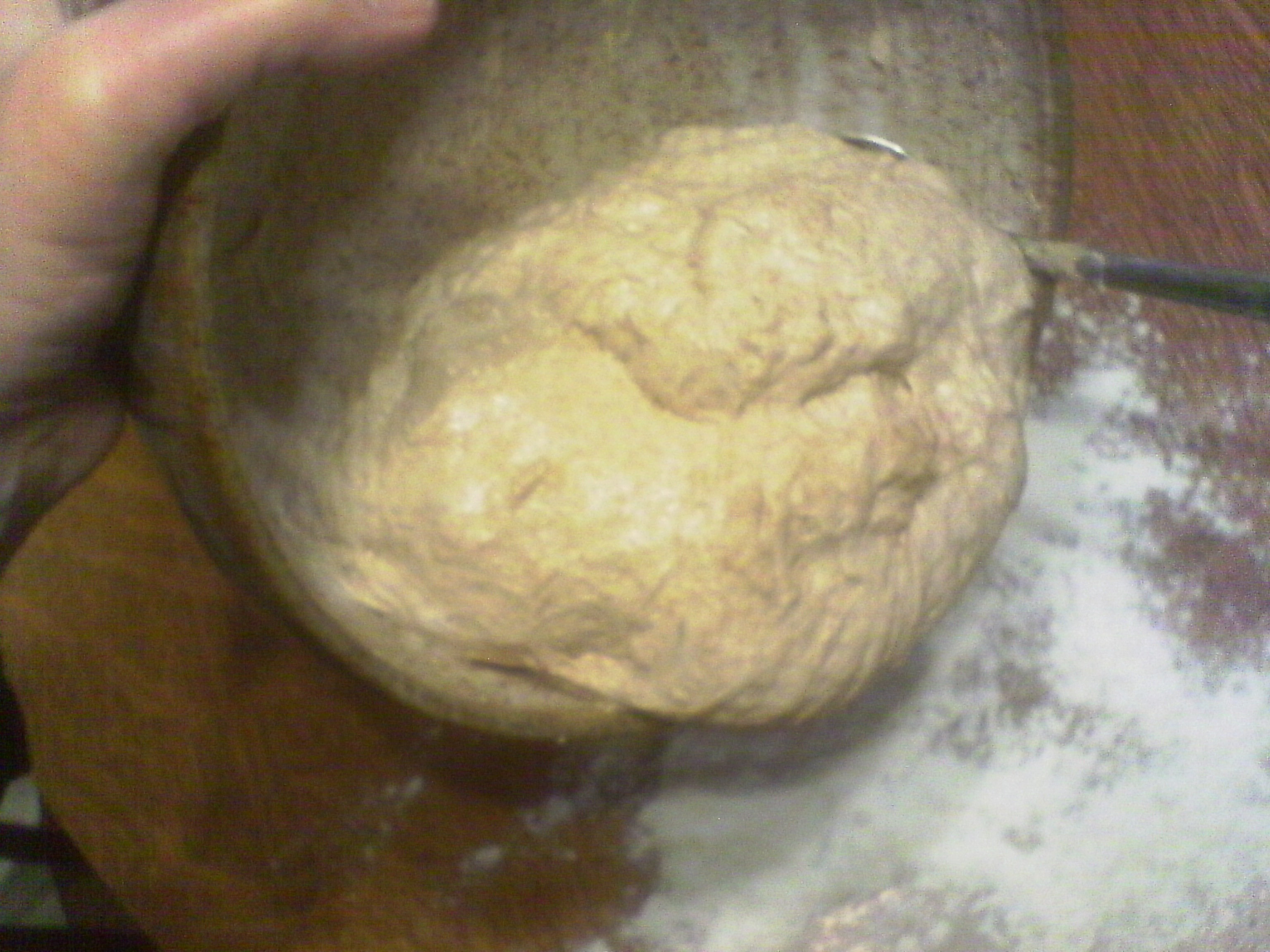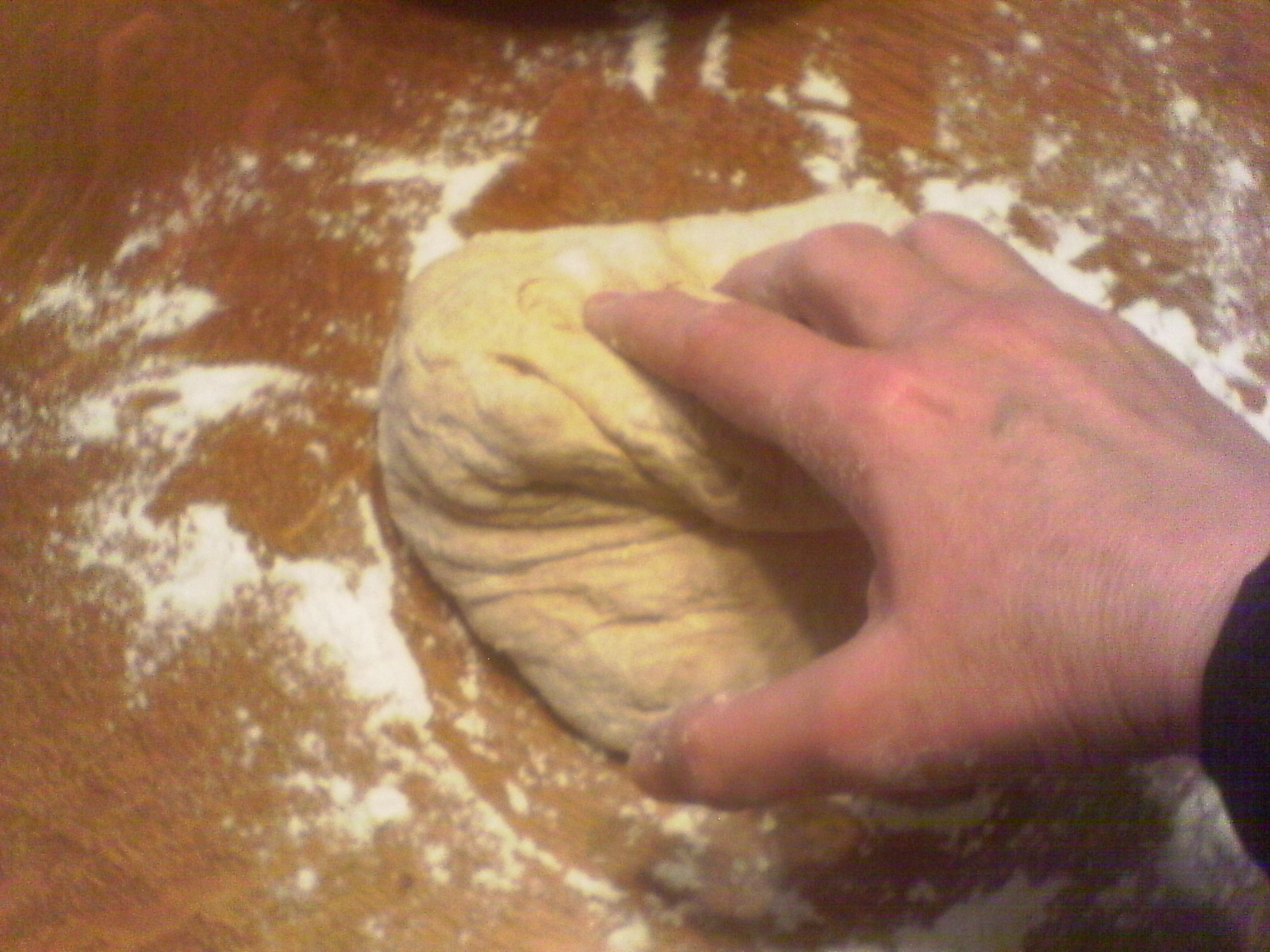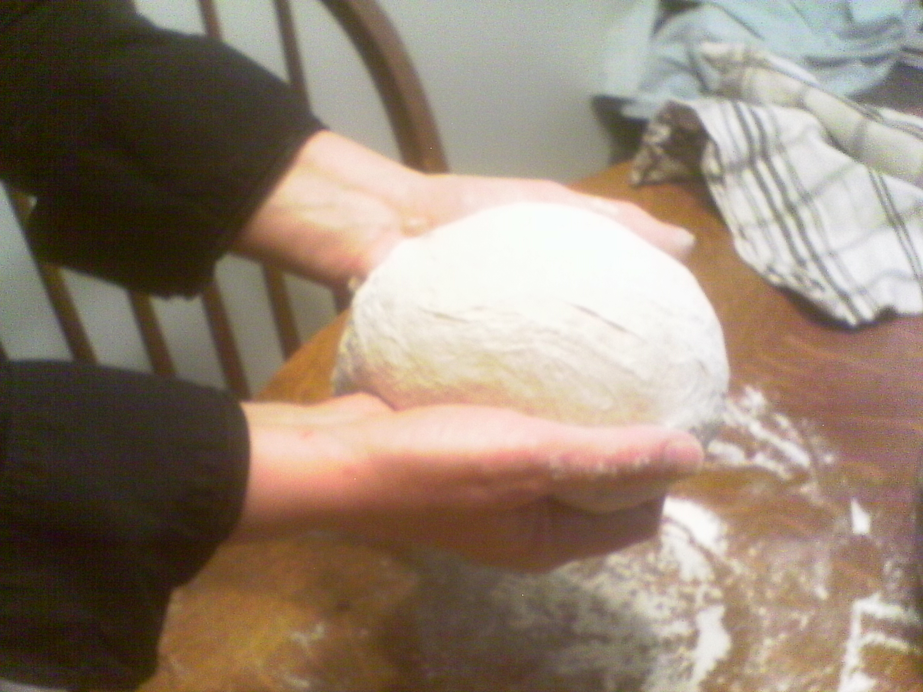 After waiting 6 hours or getting up and having breakfast and doing morning chores, maybe even 12 hours later, clean a spot on the table or counter (use simple water and soap, NOT anti-bacterial stuff that could kill your yeast!). Dry it off, sprinkle a good dusting of flour so it doesn’t stick and turn the dough out of the bowl onto the flour. Toss some flour on the top, dust your hands and start kneading. push in the middle with your left hand, grab the right side with your right hand, lift, fold, press with your left fist again. Repeat for a few minutes until it doesn’t stick anymore or you get tired. Don’t worry about over-kneading it, that’s really hard to do by hand and we modern people are usually too impatient/lazy/out of shape to do that.