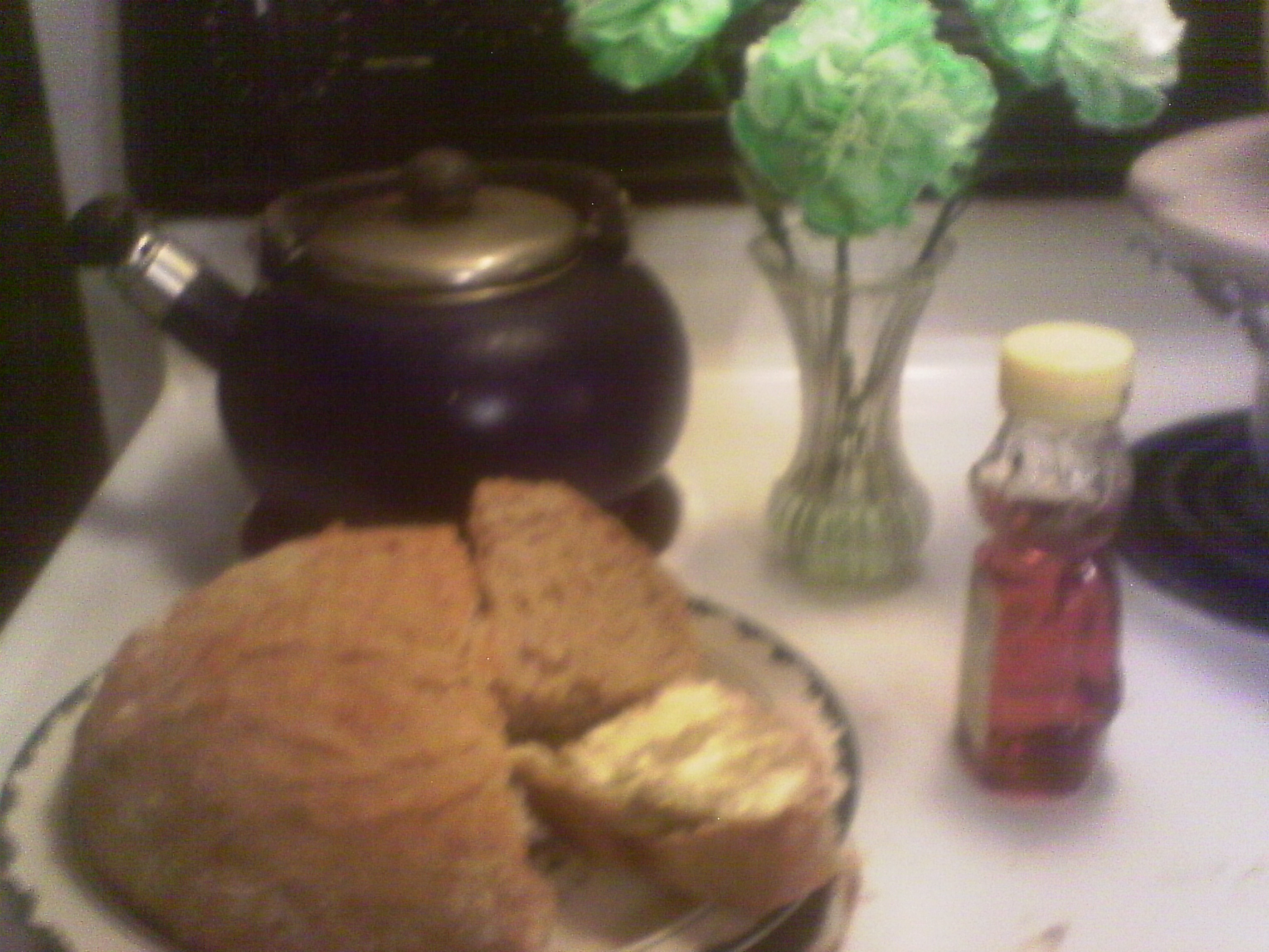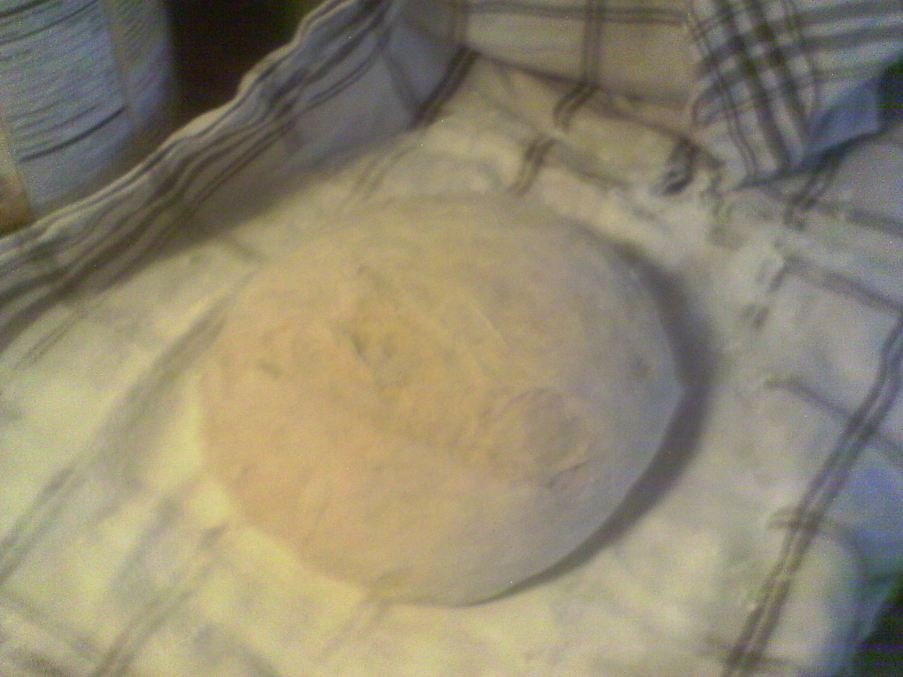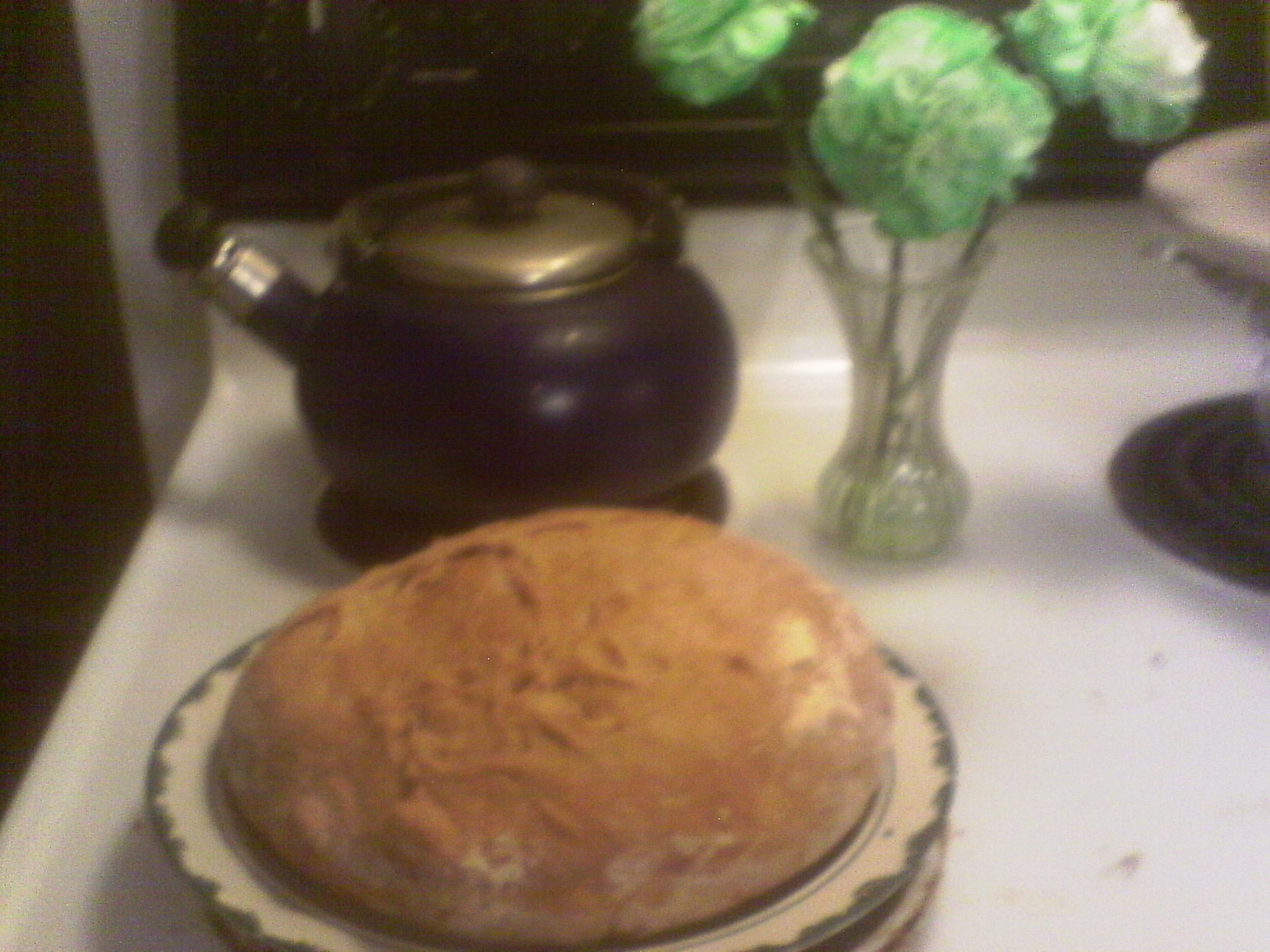 This is the simplest bread recipe I’ve ever found. I saw it originally in Mother Earth News and played with it a bit. You will need a cast iron Dutch oven. I’ve played with loaf pans and it’s OK, but you’ll need to put a pan of warm water in to keep the humidity up in the oven for a nice crust. If you don’t have loaf pans get some. Oh, darn, another shopping expedition! You’ll also need tea towels (NOT nubbly! Smooth so the dough doesn’t stick and grab!). If you don’t have a nice linen tea towel, get one. And do you have a bowl large enough for the bread dough to rise in? Sure? If your bowl is just big enough to mix in it still needs to be big enough for the dough to rise to double in size with room at the top so it doesn’t overflow. While you’re out take a look at large, cheap metal bowls. Yes, plastic will do, but metal is more versatile. If you decide you really like baking you can eventually buy a really nice ceramic bowl to mix in. I used to have one just for bread, one for pizza dough, one for cookies and one for biscuits. All started with just the right size pile of flour in the middle. As each broke I had to reconstruct my recipes. Major pain, but at least I still have my pizza bowl. It really does feel nice to mix food in a bowl that’s a work of art, and in between uses they can sit in places of honor on shelves in the kitchen or dining room or even take turns on the living room coffee table. Now back to our recipe.