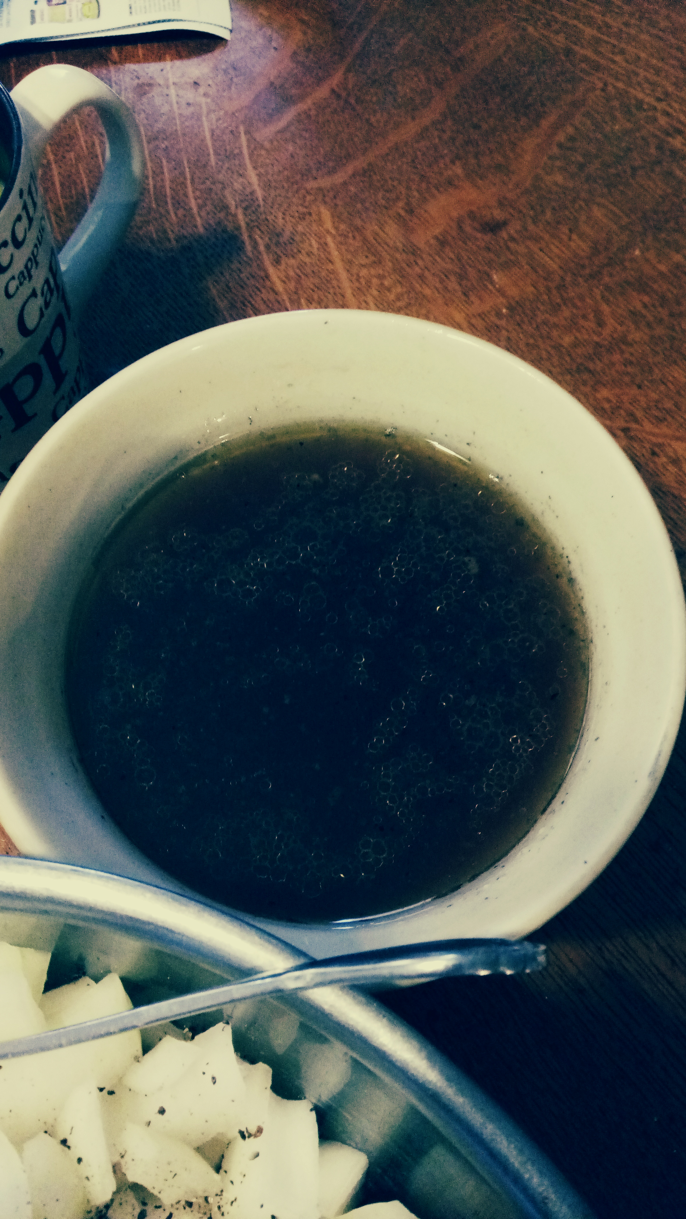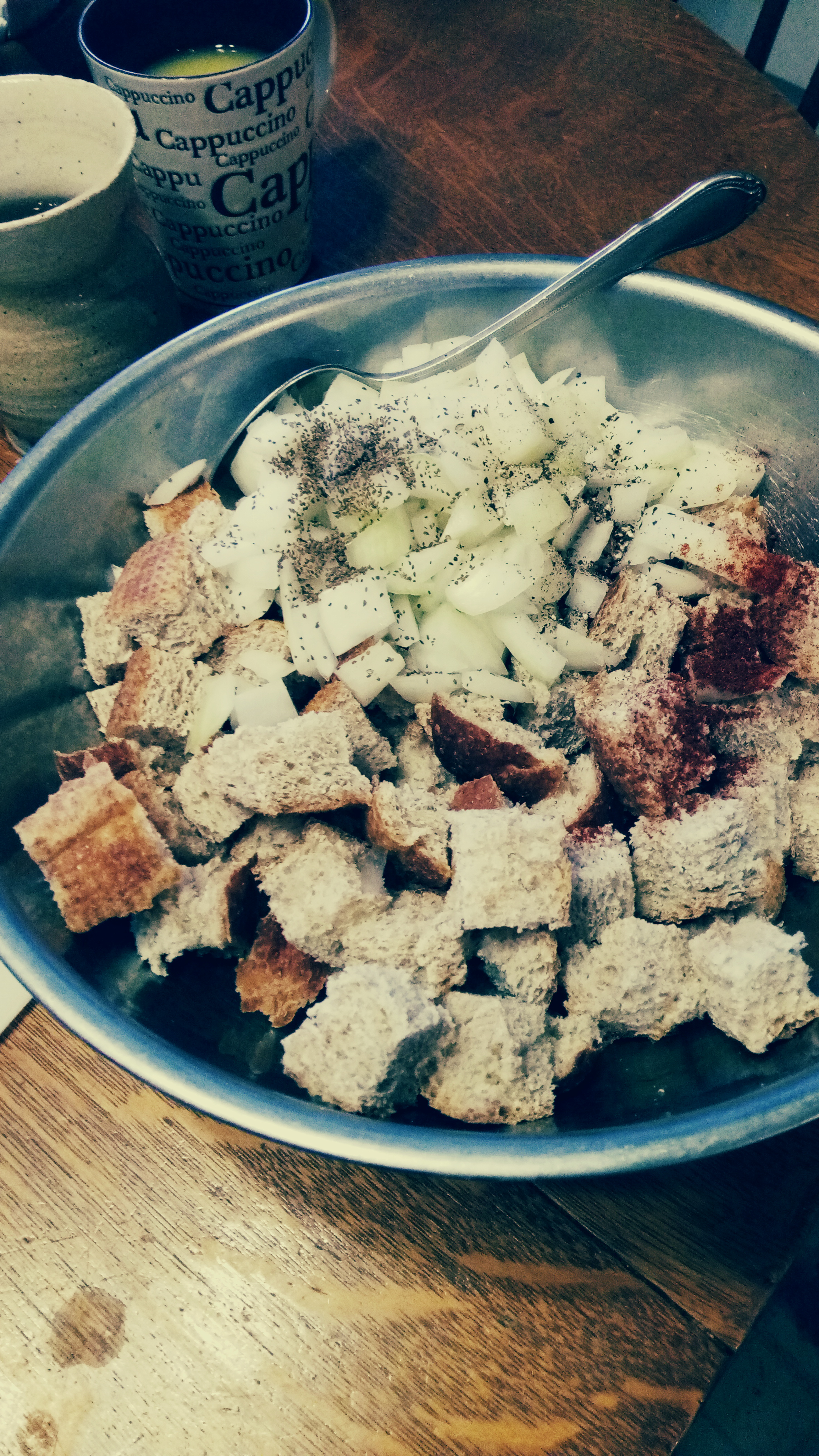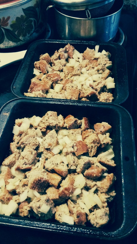 Take a large bowl and pile in it the cubed stale bread. leave room to mix it later. Mince and add 1 medium yellow onion. Mince and add 1 or 2 celery ribs. If you don’t have fresh celery you can use celery seed. Generously grate in pepper and sprinkle on some basil, garlic powder (NOT garlic salt!) and a little paprika.