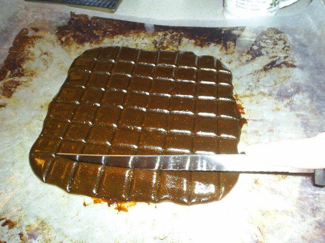 Take from heat, allow bubbles to subside and pour onto a well-buttered sheet of waxed paper on a cookie sheet. Spread into a roughly square shape with he back of a spoon. In just a few minutes (by the time I’d taken a couple of pictures) it should be cool enough to score into squares with a sharp knife. Don’t drag the knife through, just push down, lift, and move to the next area. This will create the pillow-shaped candies I remember.