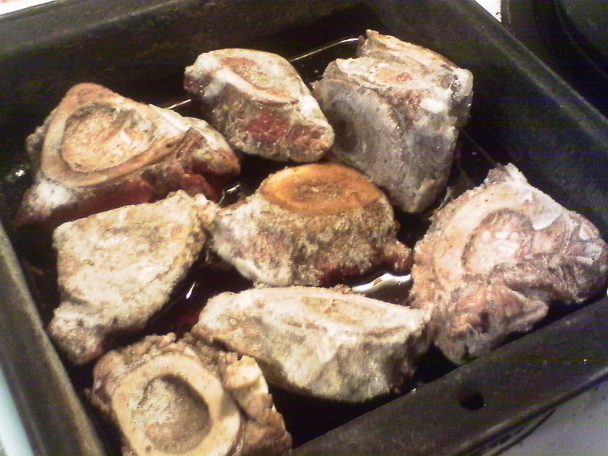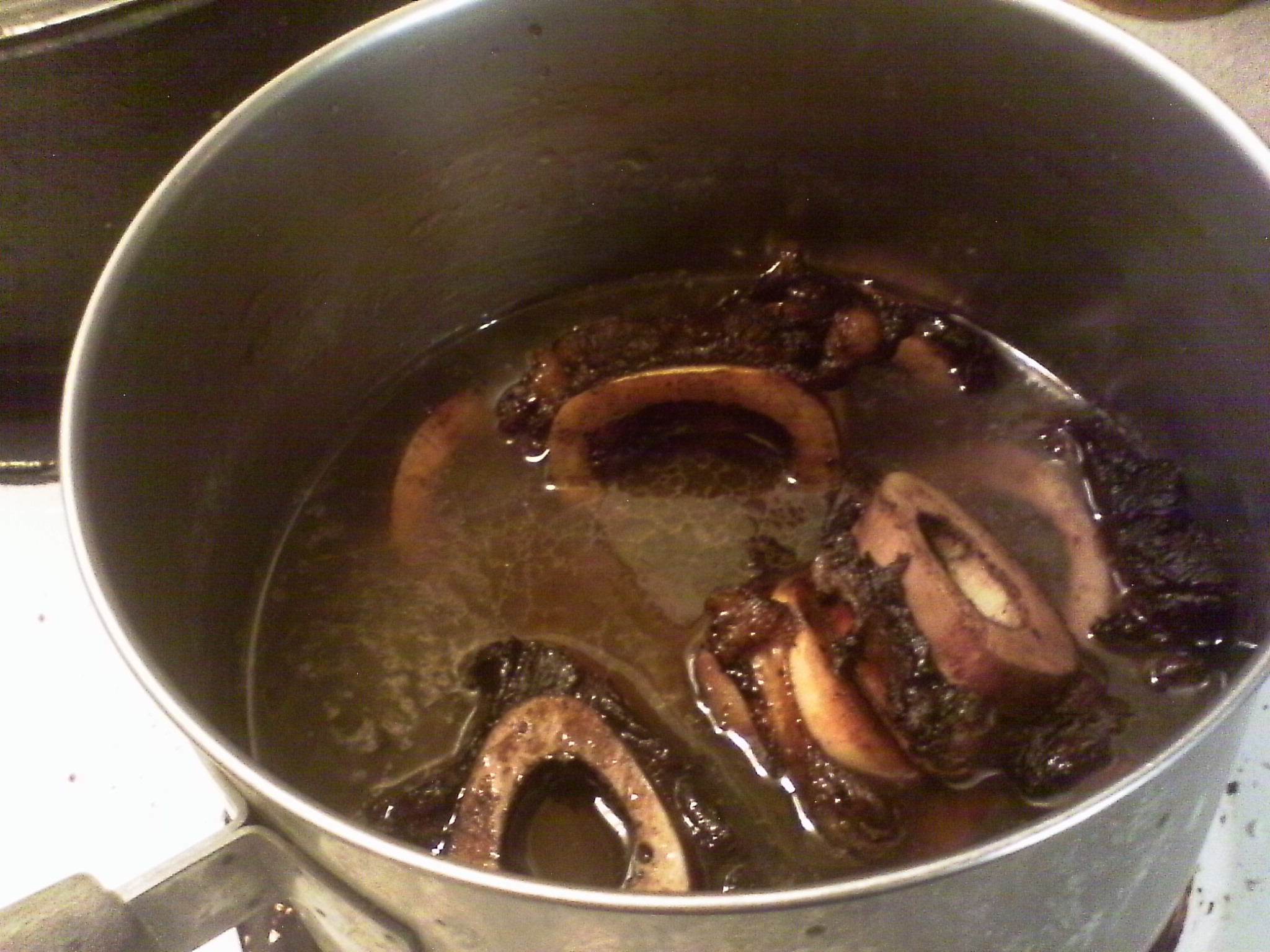 OK, now it’s Saturday and you have time to make broth. See my post on making broth from chicken/turkey/etc. bones/carcasses. I suggest you make the broth on Saturday and the soup on Sunday so you can refrigerate the broth and the fat is easy to take off when it’s solid. If you don’t mind the fat (more or less, depending on how much went in with the bones and scraps) or if you’re just impatient you can go ahead and make the soup on Saturday. Pull the bones out of the freezer and roast them for an hour in wine.