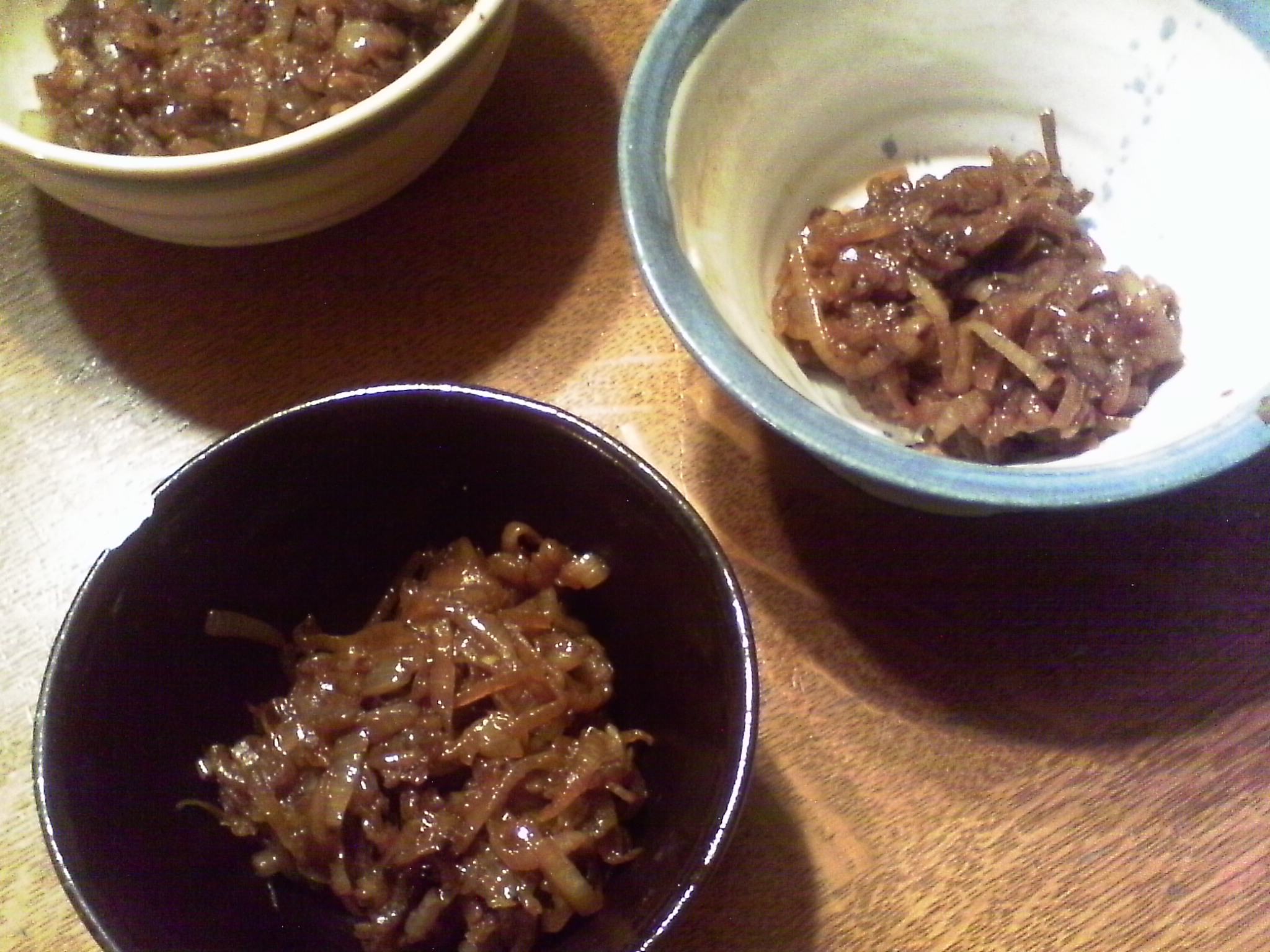 Get the broth out of the fridge and warm it in a pan. Slice a few large onions into rings or C’s, more if your onions are small, fewer if they’re larger,
