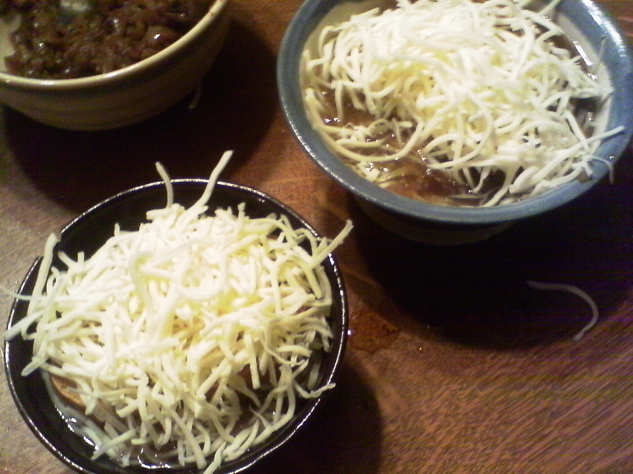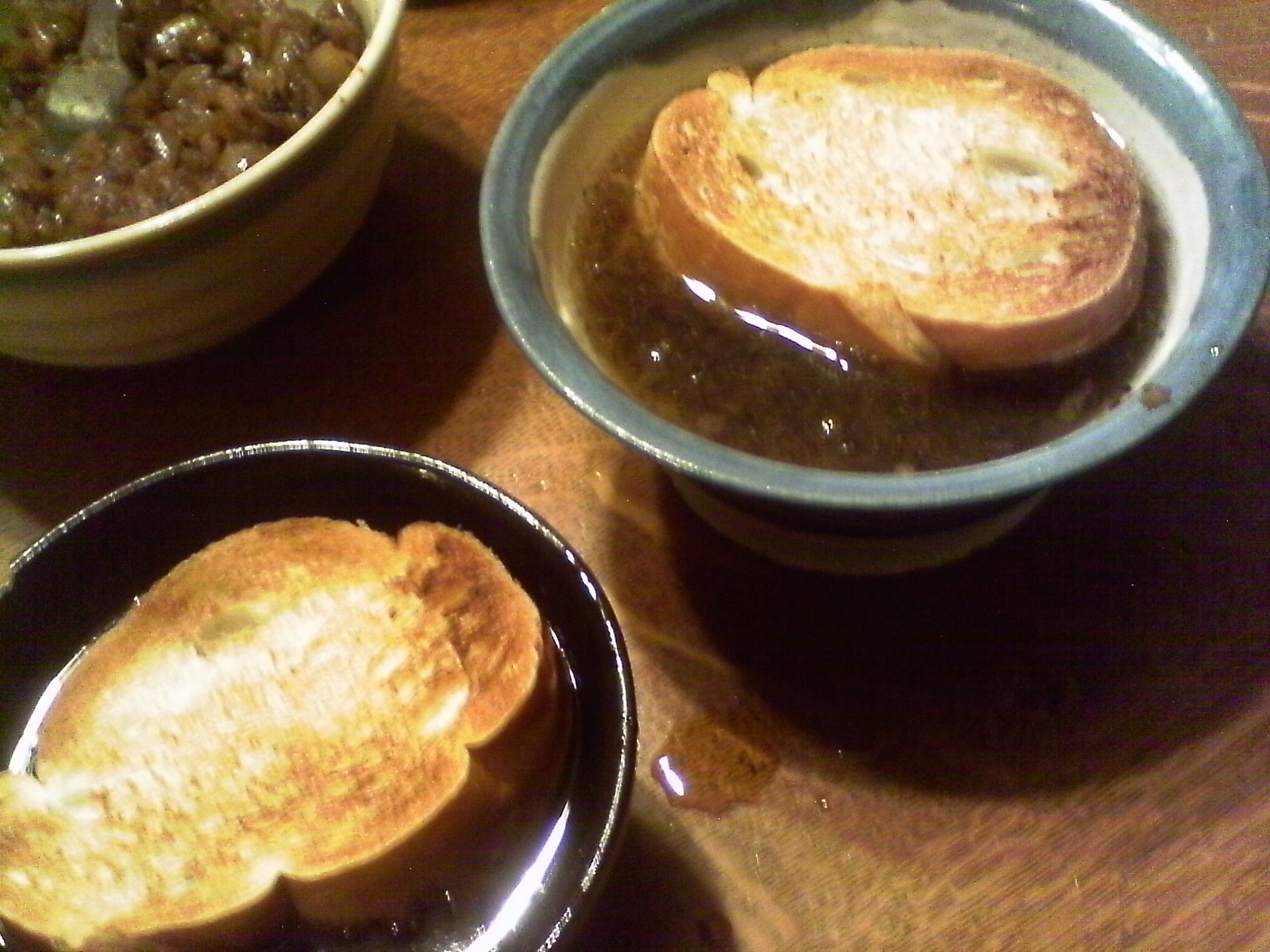 OK, Now it’s Sunday afternoon and you’re planning a nice dinner for…? Let’s say 2. That’s easy to work with, and if you need 4 or 6 you can do the math. If you had a salad Friday and used a head of lettuce instead of just one of those bags o’ scraps it’ll still be good. Tear it into salad bowls and add any other yummy stuff like cucumbers, tomatoes, walnuts, onions, cheese and or croutons made from leftover Saturday bread. Now take the leftover bread from Saturday night and make 1 thick-ish slice for each bowl and toast them lightly and cut the rest into cubes for croutons. If you want veggies on the side broccoli, cauliflower asparagus or artichokes are nice. Grate your cheese: mozzarella, Swiss, Muenster, mild cheddar, whatever you like, just not terribly strong. I wouldn’t use a strong cheese. OK, you might, but I wouldn’t. Don’t want it to fight with the broth and onions.