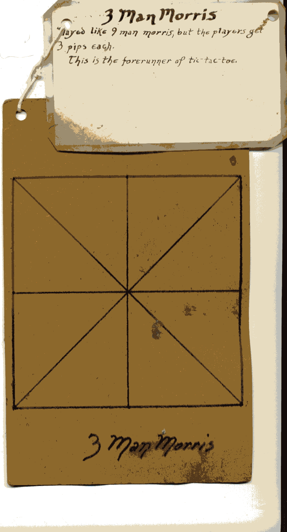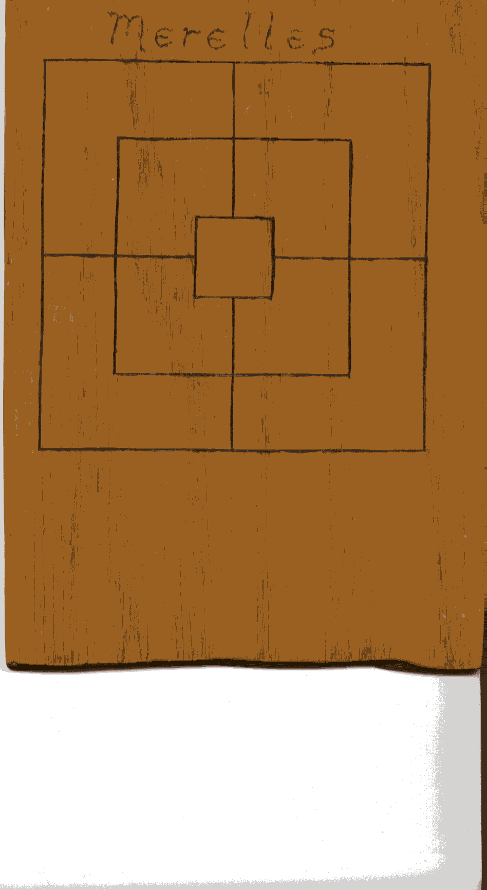1 board, 2 players, 9 markers each. Take turns and play nice! I know I have a 9 holes, 5 man morris and a 12 man morris board around somewhere, I just can’t lay hand on them just now. 9 holes is just a square divided into 9 parts with a tic tac toe grid, or tic tac toe with a box drawn around it. The 5 man morris is just like the 9 man morris but without the 3rd outer square. The board isn’t supposed to have a line all the way through the middle, so I put a vine on this one so players can’t climb/move along it.