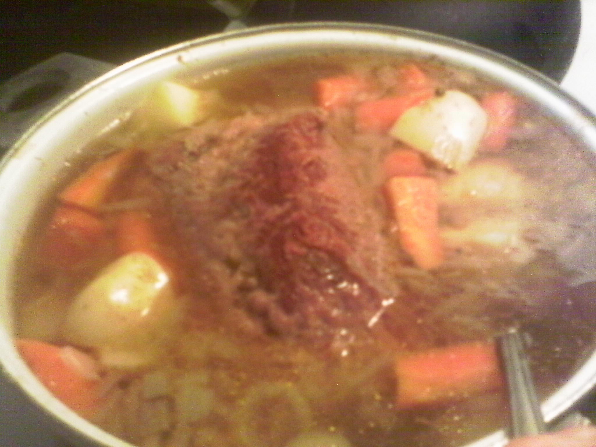 Cat and the kids were over for dinner the year I originally wrote this and we were very full with plenty of leftovers and the dogs got a treat. As we ate I mentioned some exceptional corned beef I’d recently had at an elaborate gathering of friends. My friend had used brown sugar and I don’t remember what else, but Cat said “don’t abuse my cabbage!” so I guess I’ll stick with this…for now. The next day we had enough for a second dinner for all of us and there was enough after that for another dinner for me tonight. The dogs got the leftover cooking water as a treat. Kenzie asked for bonfire candy I still have in a tin as I dished out ice cream for desert. I finally took photos to insert of the cookin’ but forgot to take any of the finished meal til it was put away! At least we have happy tummies all around.