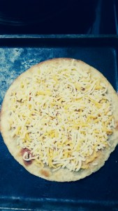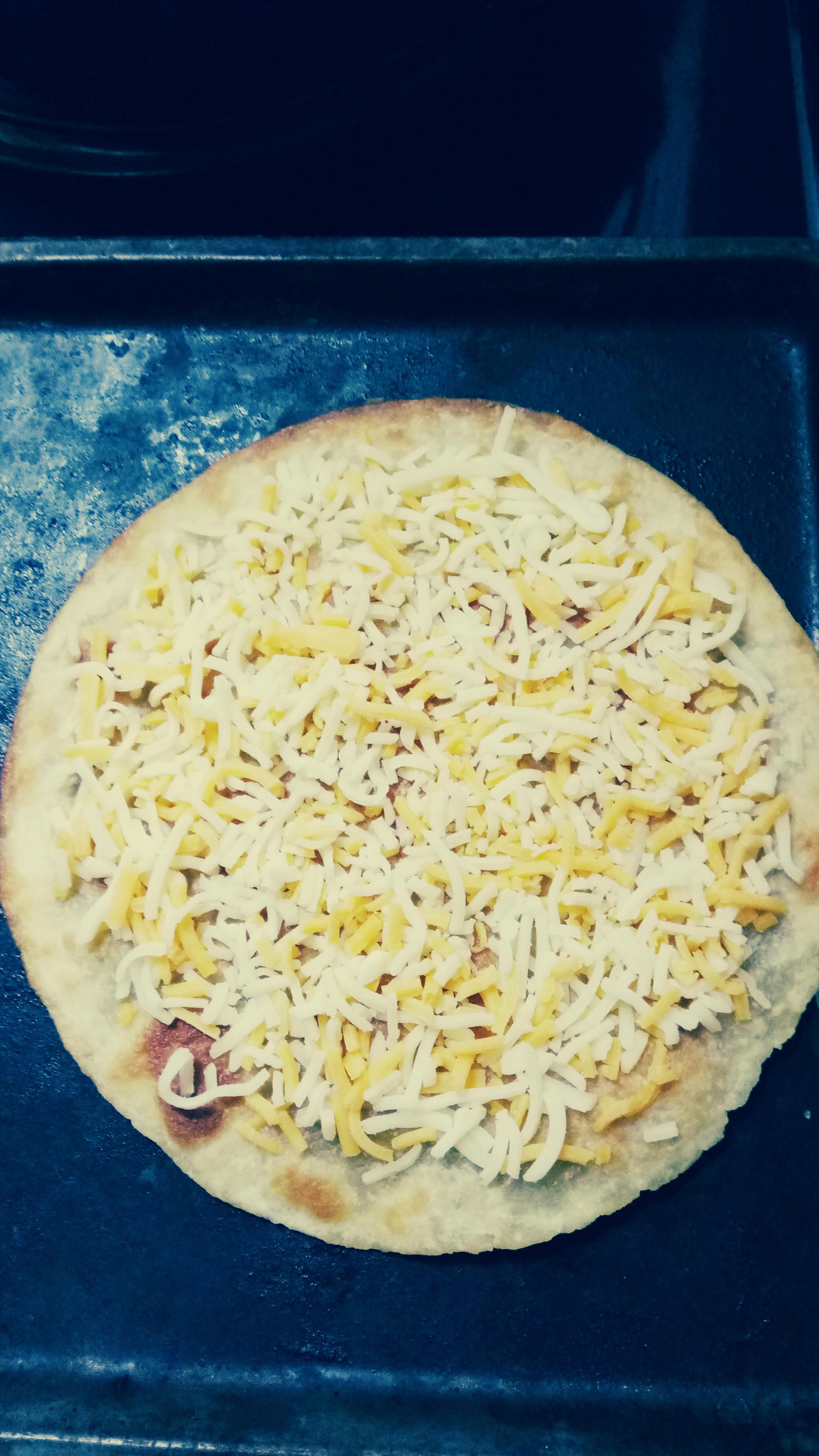 Now back to the original thought. Either grate cheese (hard if you only have one functioning hand), so use a food processor or open the bag of grated cheese. Sprinkle the cheese evenly over the tortilla. Some people like less cheese that gets kind of brown and crispy under the broiler while other people like more cheese that stays soft and melty on a crispy tortilla.