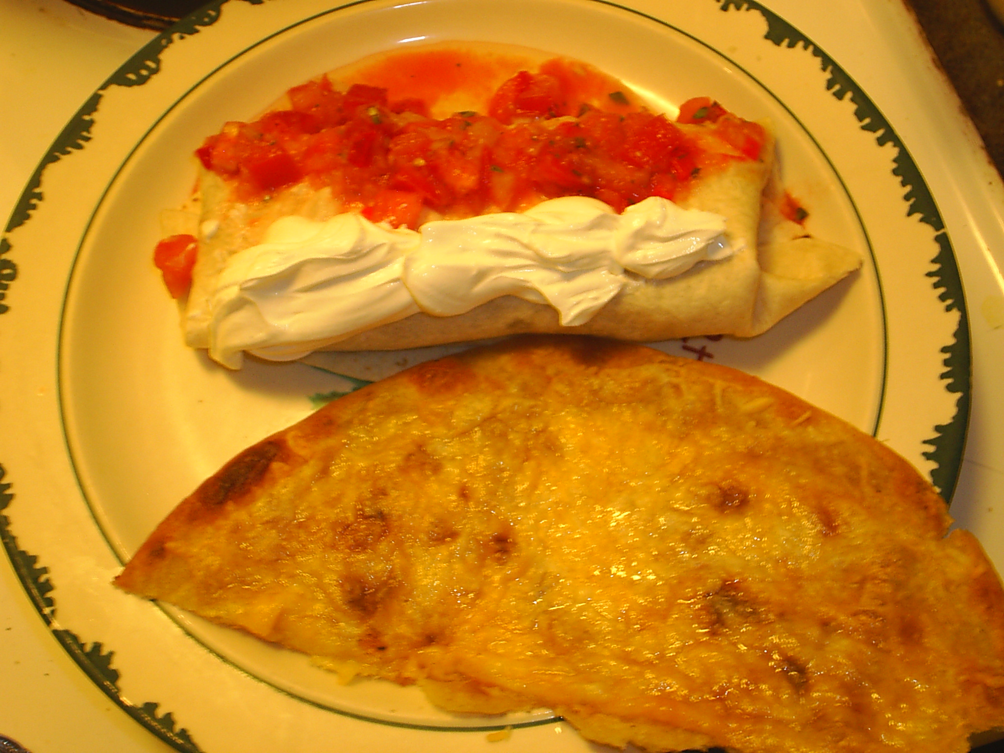 Tonight’s dinner: cheese, beef and bean burro and a cheese crisp.