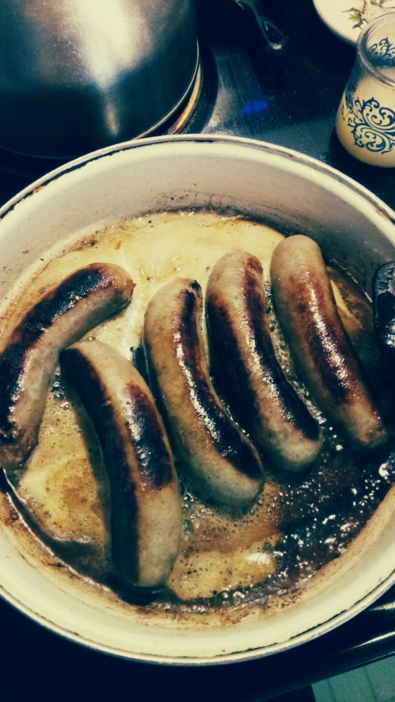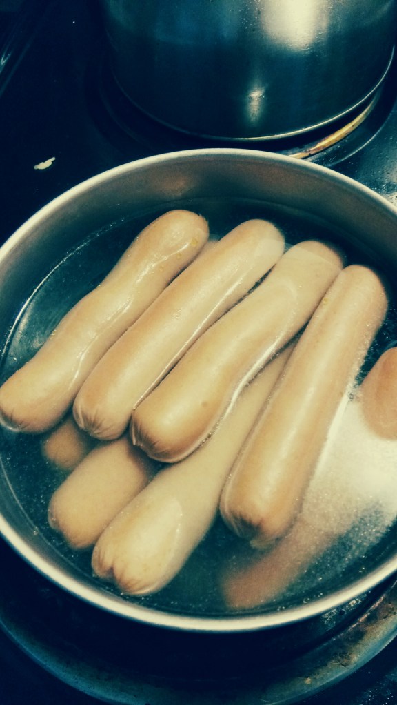 So…how to cook them? Easy. Boil them. 10 to 15 minutes in a pot of water should do. You could add beer, broth or wine depending on the kind of hot dogs or sausages you use. I usually spear them with a fork but it’s probably better to fish them out with a pair of tongs.