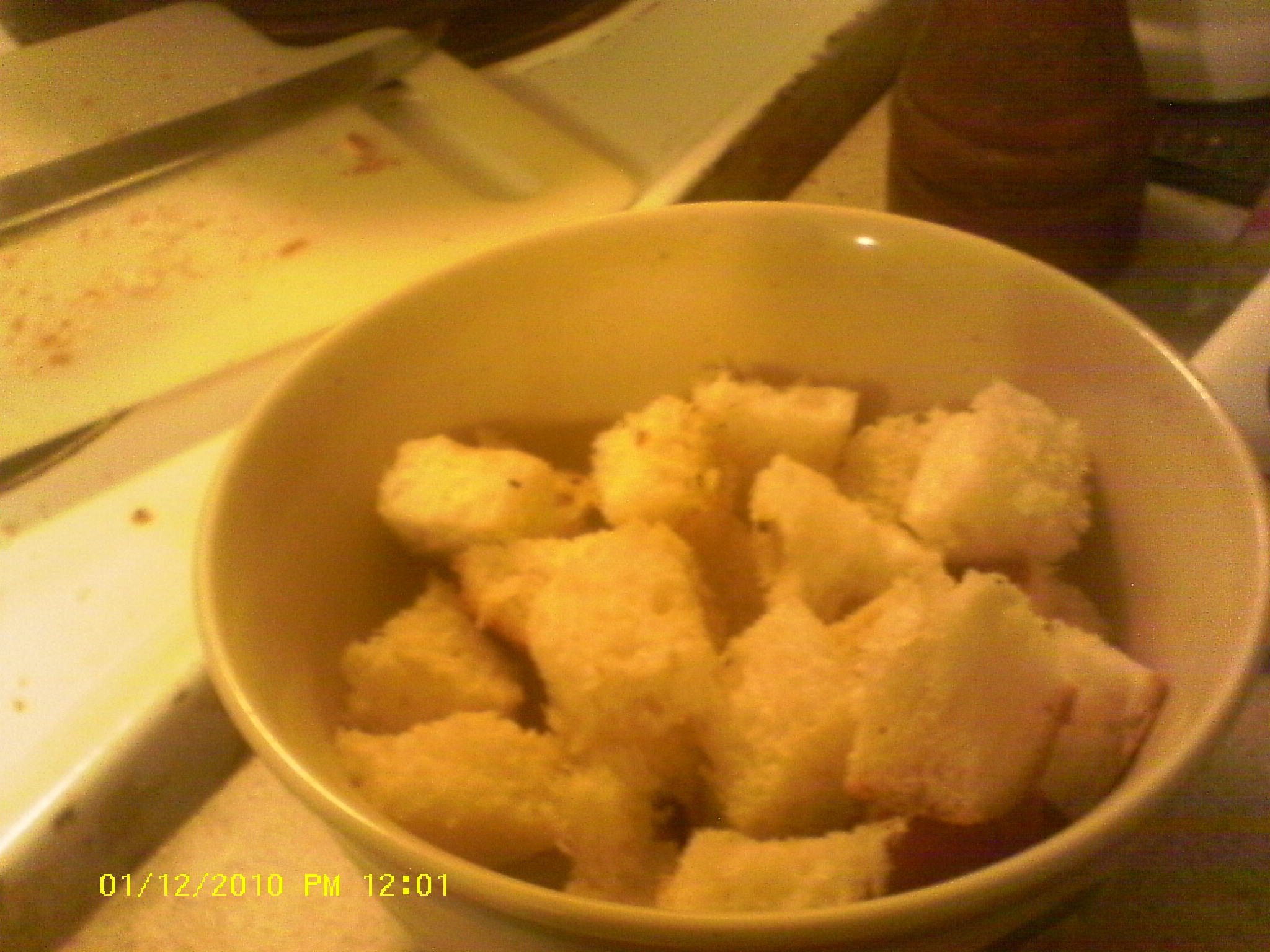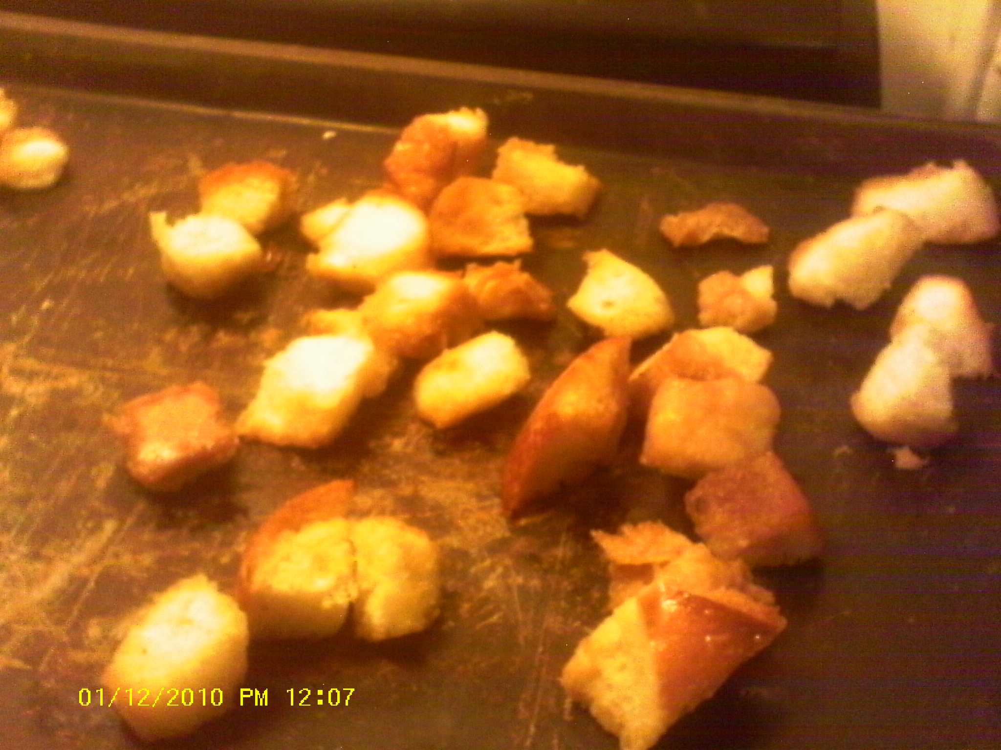 Spread the cubes on a cookie sheet, repeat if you have more bread cubes until they are all flavoured up. Dry them in a warm oven (250-350 degrees f) until golden brown.
