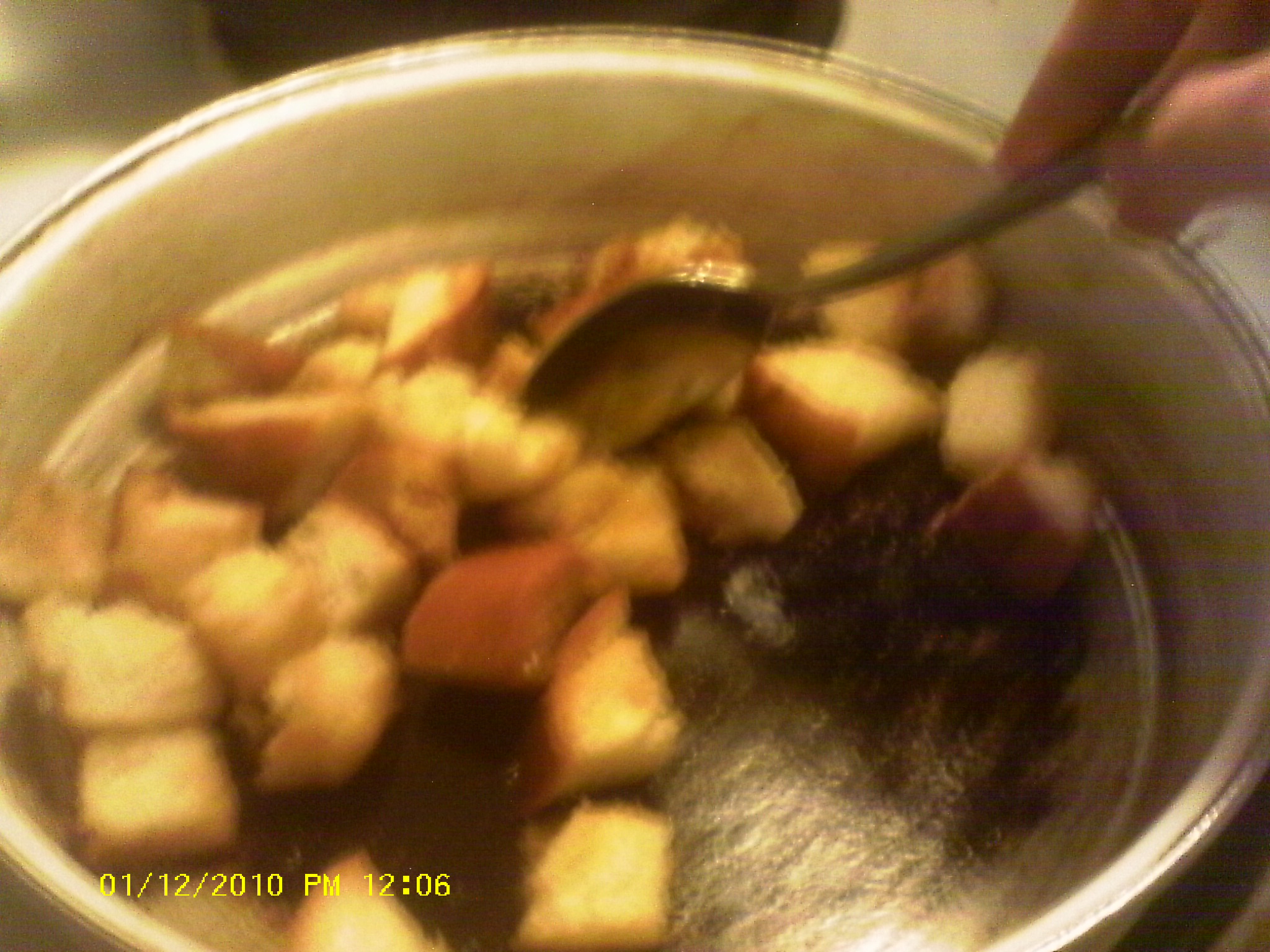 Add Worcestershire sauce and any other flavourings you like at the moment (garlic, pepper, basil…). Saute a layer of bread cubes until they all have some flavour on them and they’ve sopped up the butter.