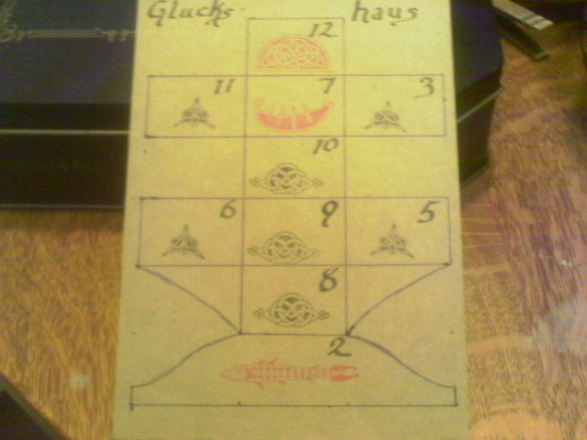 Believe it or not, this is an ancestor of roulette and dates from the late medieval period. Gluckshaus means house of luck or fortune. The board can be as ornate or simple as you’d like to make it. I rather like this form. It has 10 cells numbered 2-12, leaving out number 4. Cell 2 has a pig in it (in my picture I used a fish since I didn’t have a piggie stamp and trouts and salmons can be lucky), 7 is a wedding scene or rings or something that symbolizes wedding (the closest I had was a boat, voyage of wedded bliss…yeah, I know, it’s a stretch), and 12 is a king or throne or crown or something else that symbolizes royalty. When you make your own board you can leave other cells plain or have pictures of everyday things as you like.