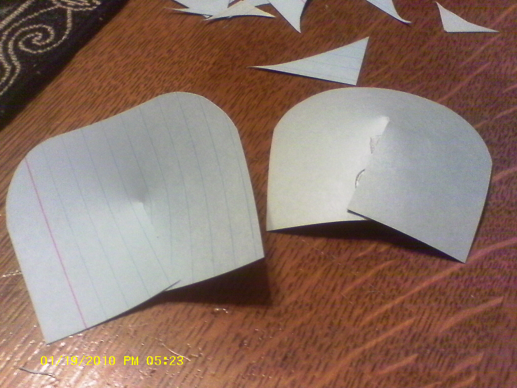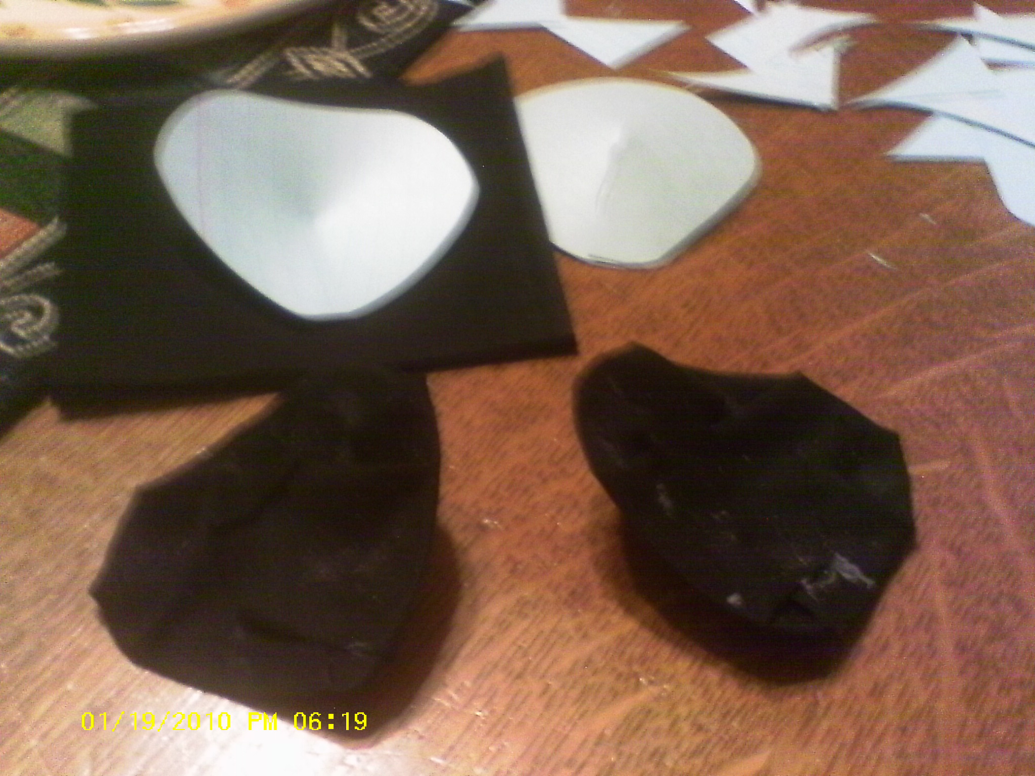 First I cut the shape I needed, making sure it would cover my eye. Then I realized that it was flat and needed dimension. Crap. Back to one. At least I now had a template.