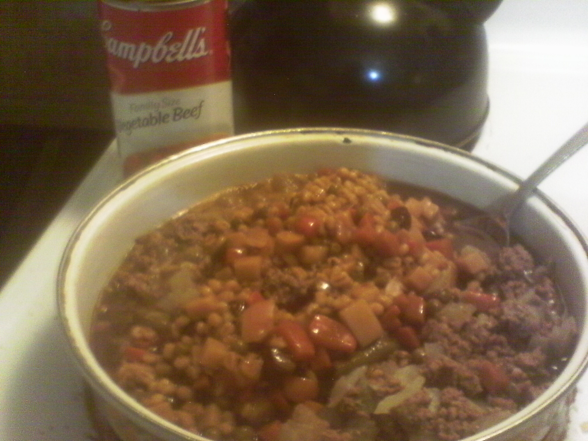Scramble 1 lb of hamburger with 1 chopped onion. When the meat is brown add 1 large can of vegetable beef soup. Rinse the can with wine. Season with Worcestershire sauce, pepper, garlic, basil and whatever sounds good. Cook down into a nice thick stew consistency, then let it cool.