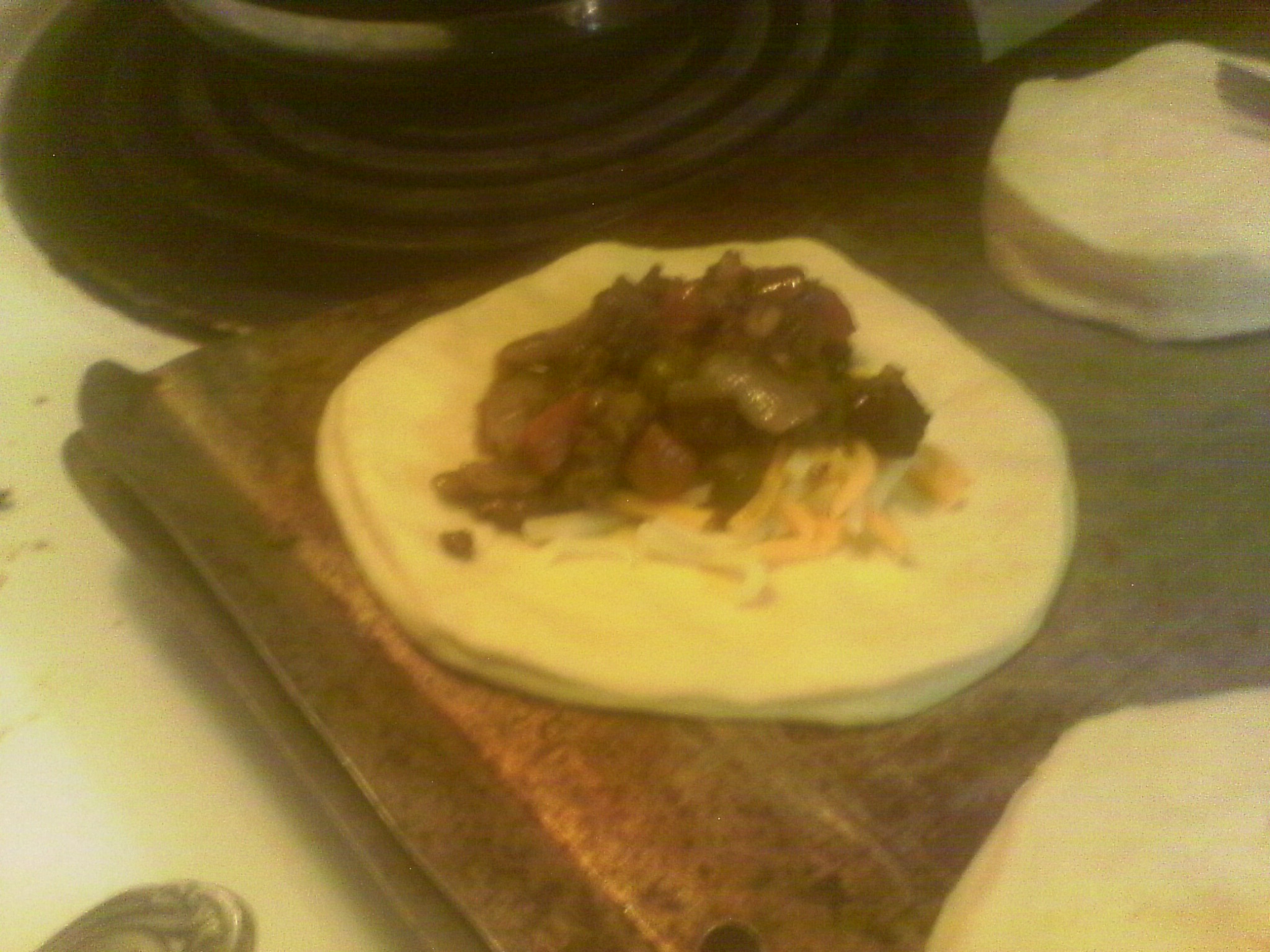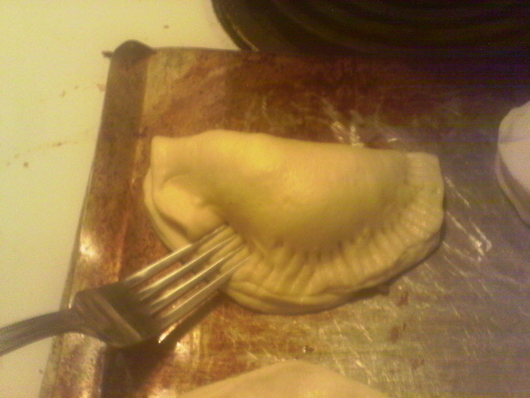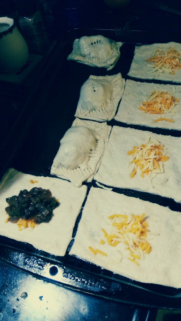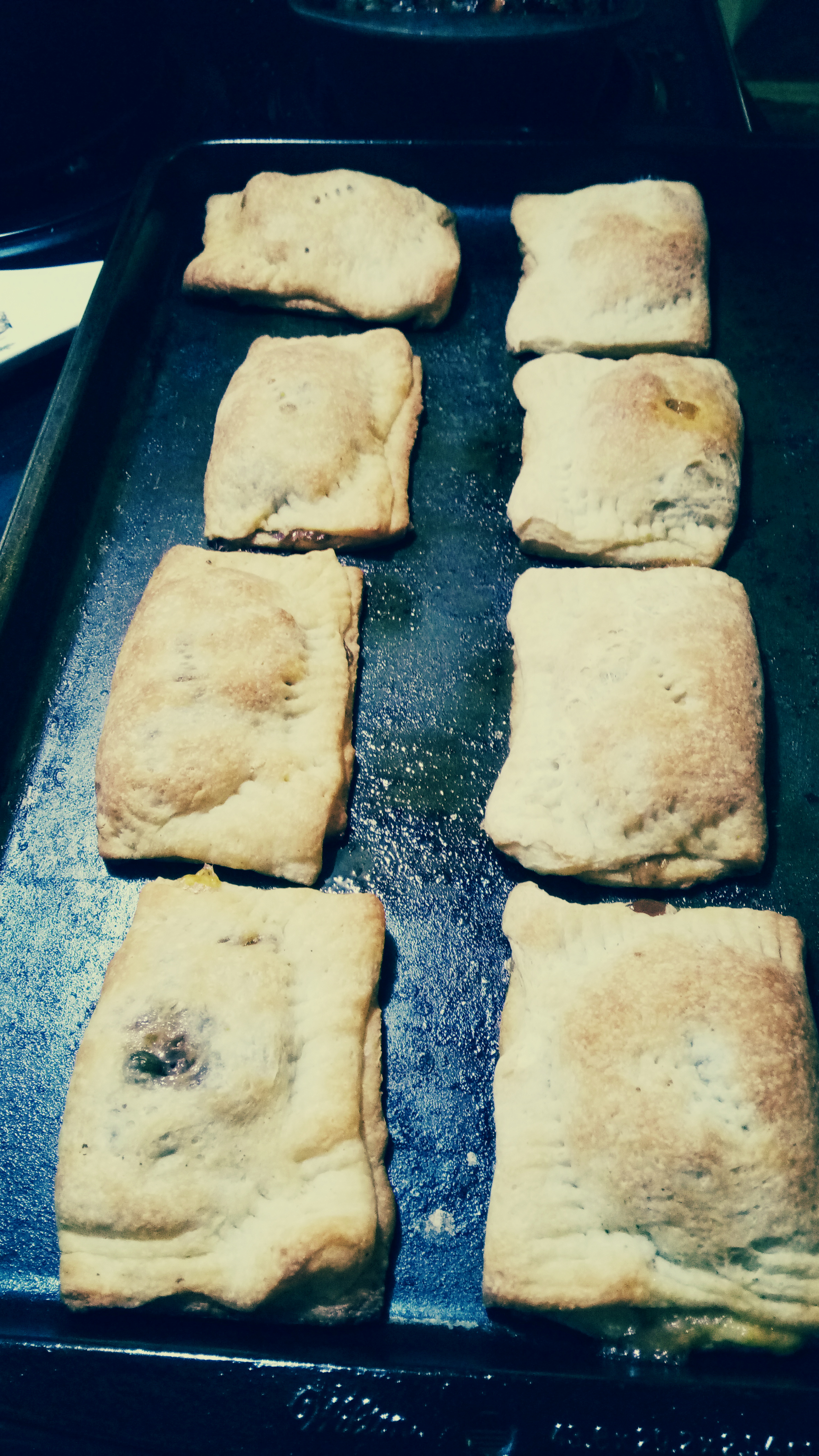 I sprayed a pan with oil, unrolled the pizza crust and spread it out. Then I cut it into 8 portions. After that it was just like any pasty, add cheese