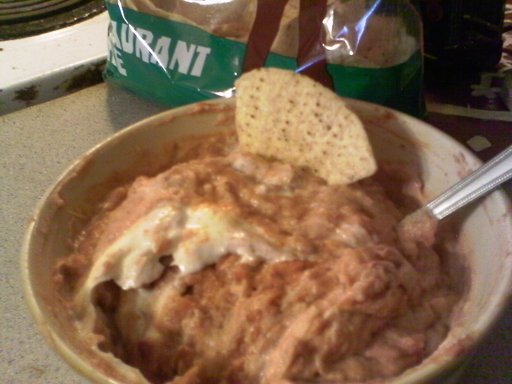 Open a can of refried beans into a bowl. Add a handful of grated cheese and some salsa. I use mild so anyone can enjoy and people who want more heat can add it.