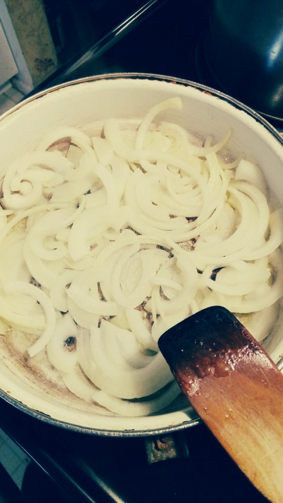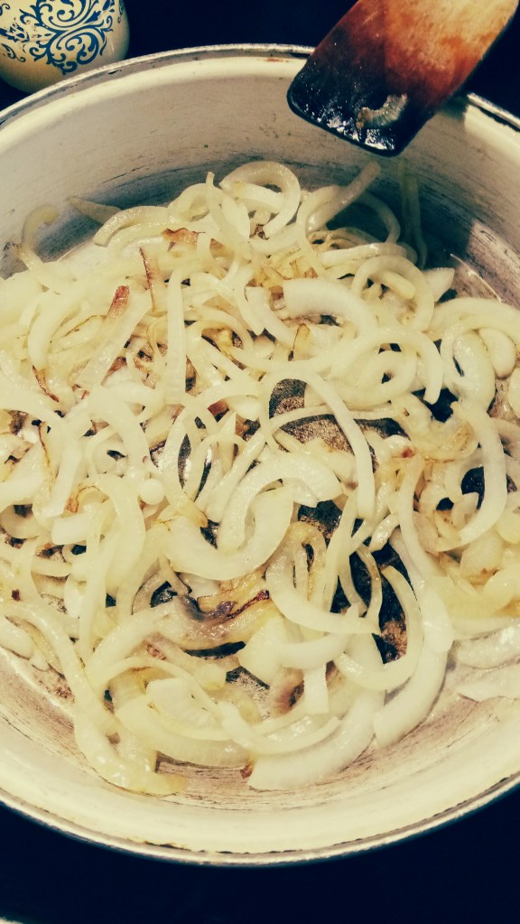 Keep stirring as they show colour. They’ll cook down and make less than you expect, so if you might want to cut up 2 or 3 large onions, fry them all at once and just keep at it. It’ll take time, but it’s worth it.