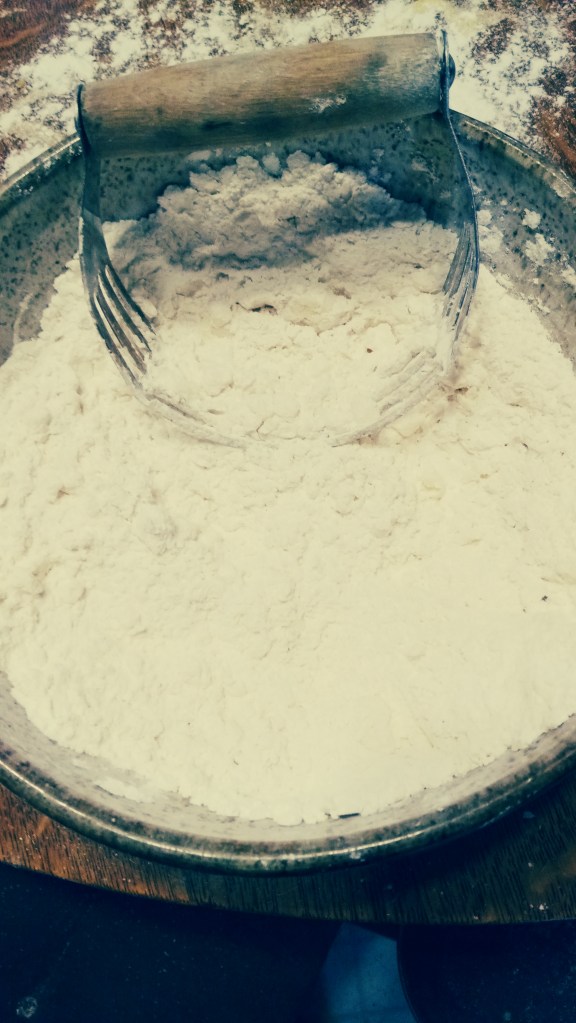 Cut the butter into they flour until it’s rough and looks sandy. Add the water a bit at a time til it’s thick and manageable.