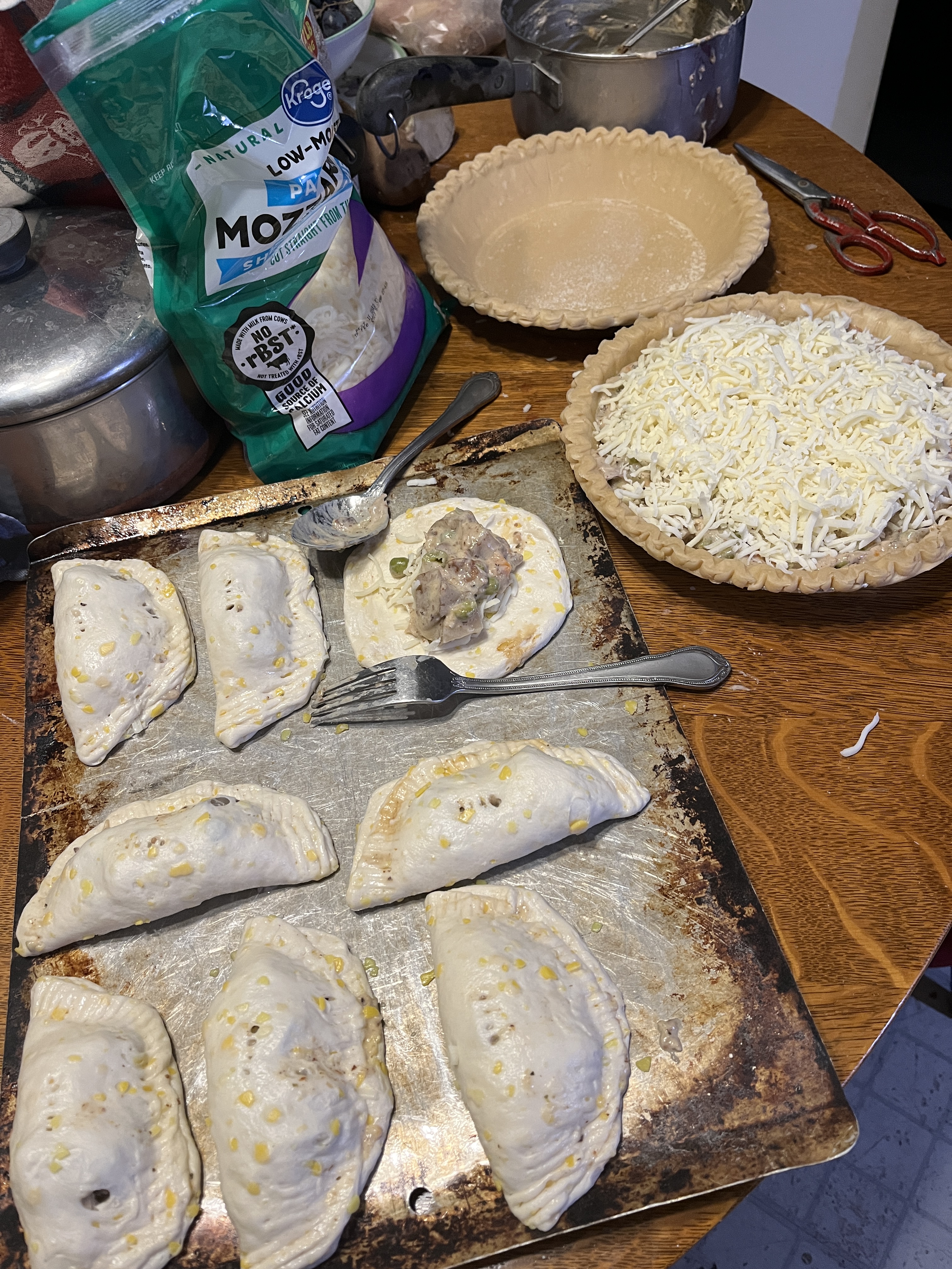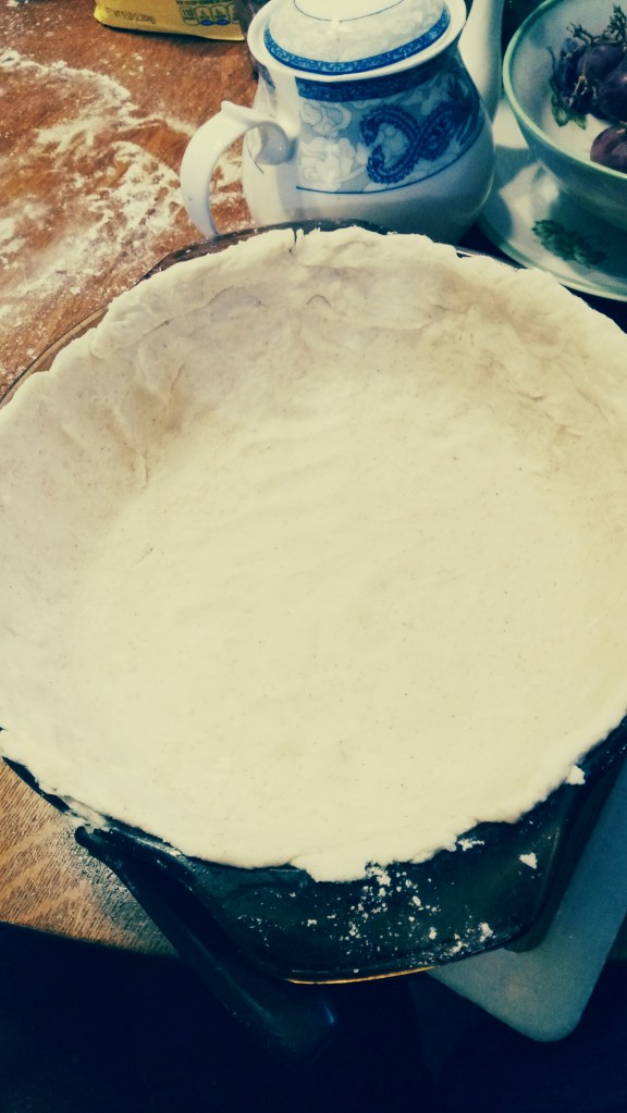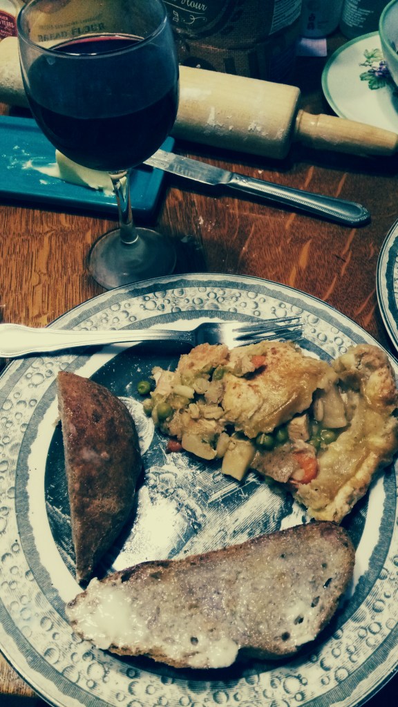 What do you do with that soup you’ve had 2 nights this week and want something different with what little’s left? Make a pie! It can be any kind of soup, but chicken is kind of ubiquitous. This time I had enough for a deep casserole pie that was less soupy than before, but other times I’ve had just enough to fill a regular piecrust or a couple single ramekins. You could even use it to make a few pasties for lunches. What you make is up to you and what you have.