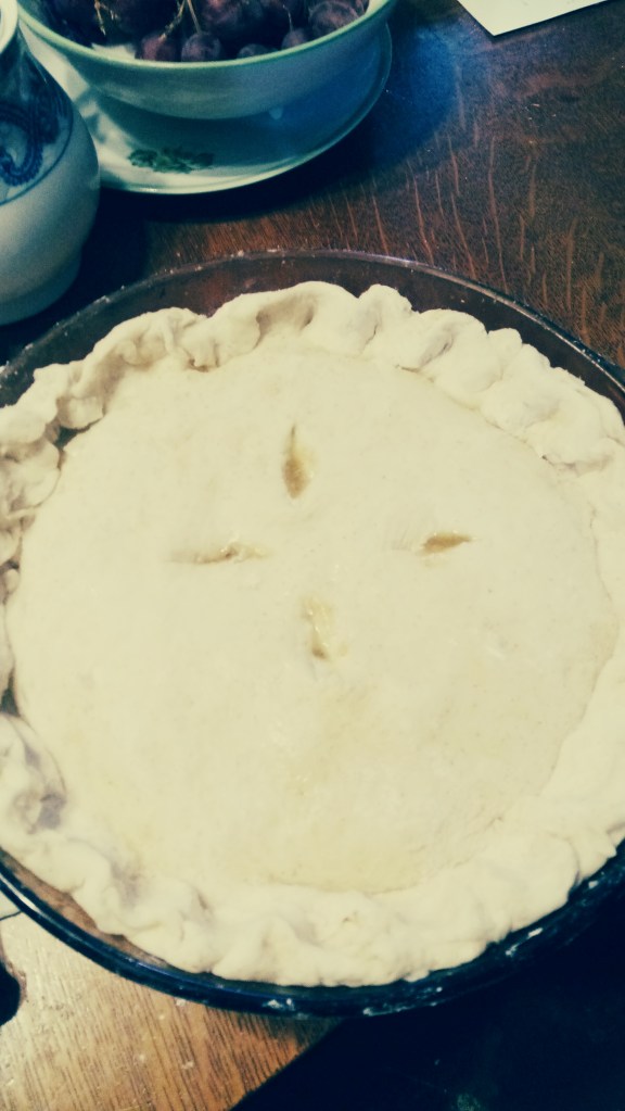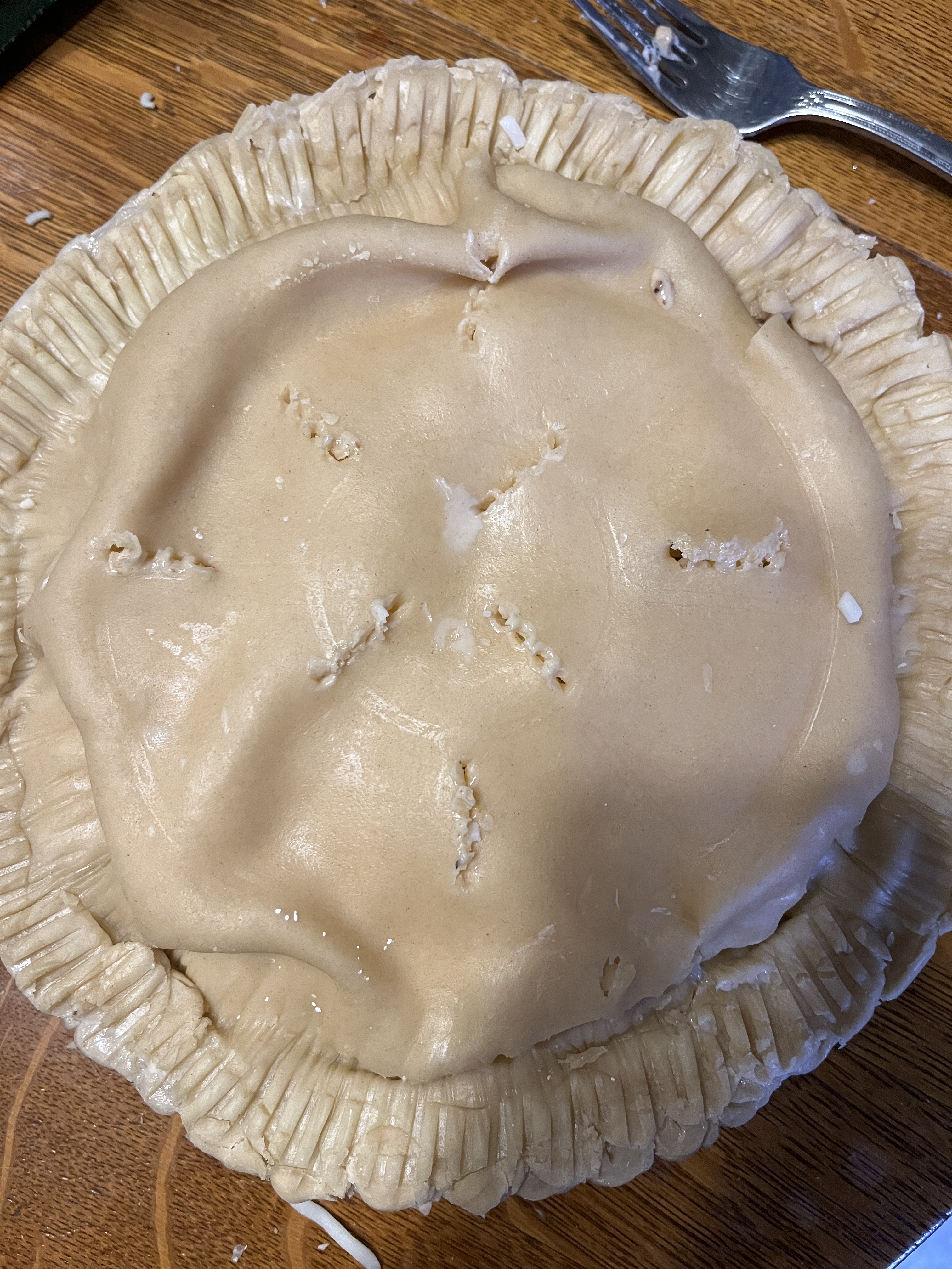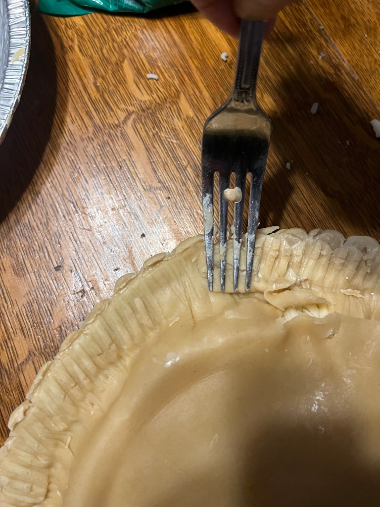 Pierce with a fork in an attractive pattern. You can cut nice sits in with a knife, too. Painting it with egg wash will make it a nice, shiny brown, but that’s optional. I didn’t do that this time.