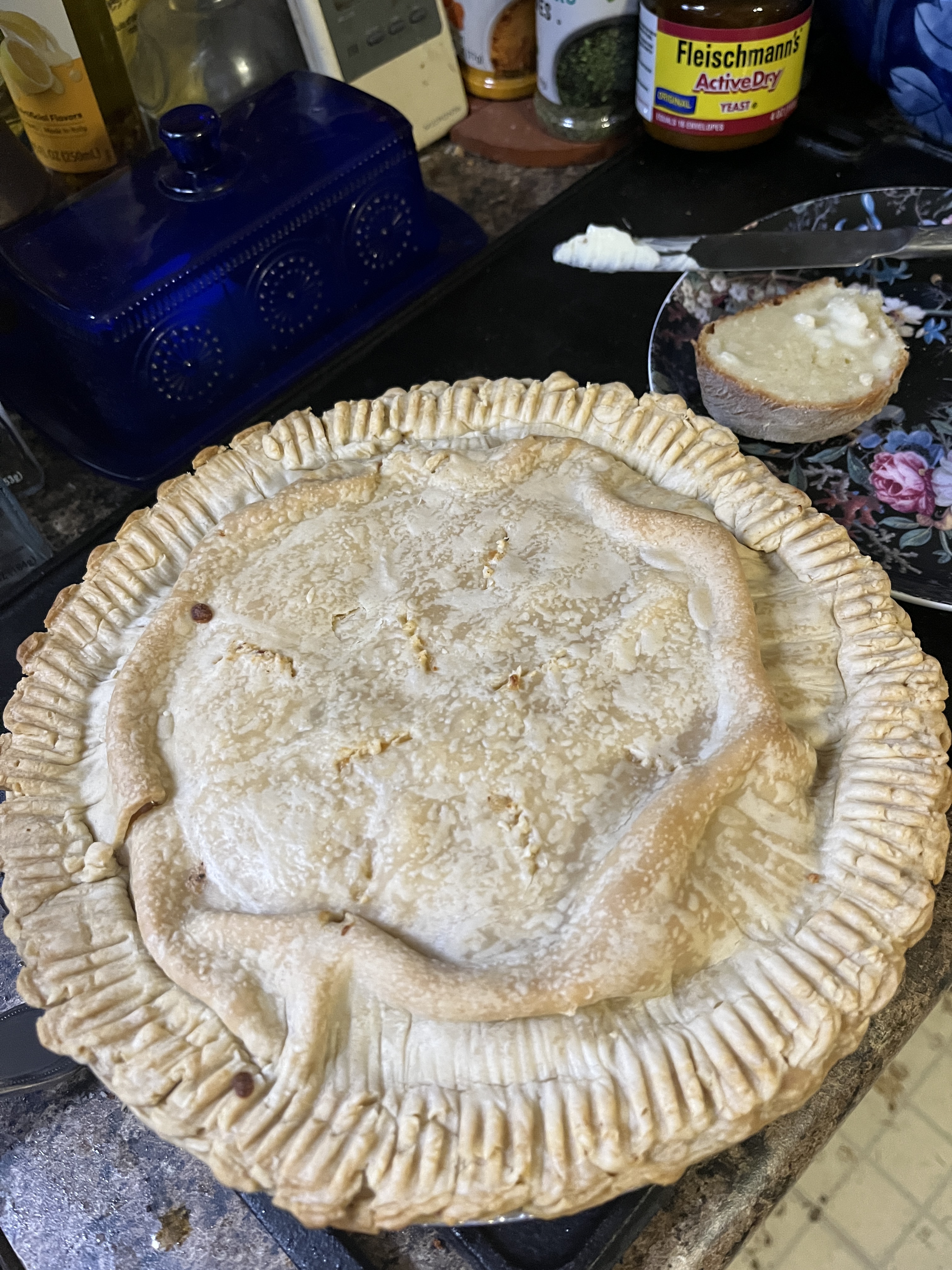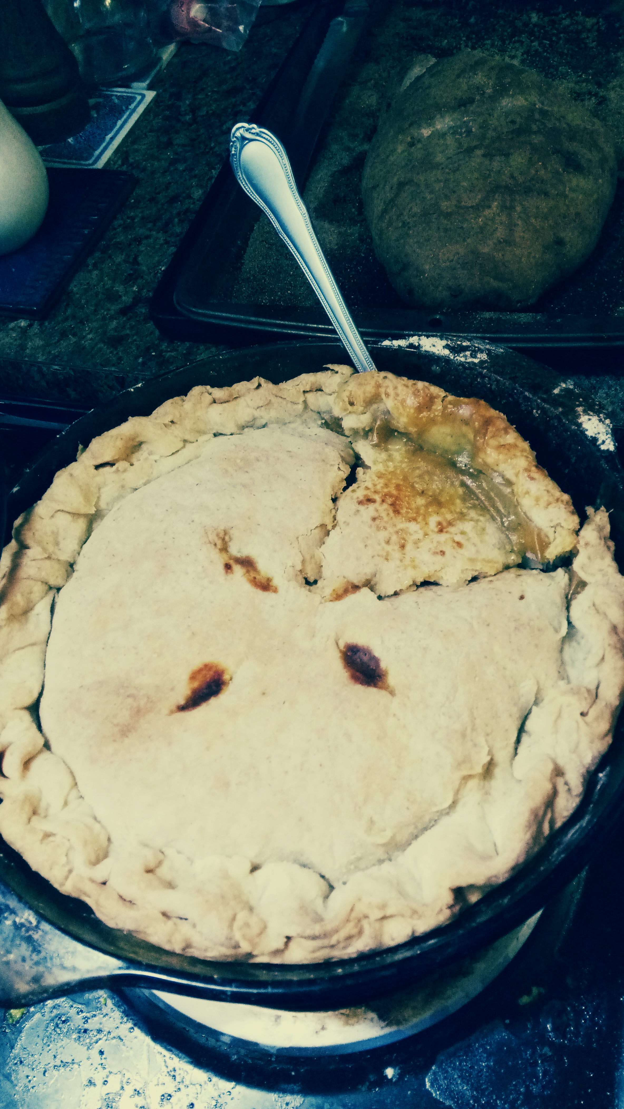 Roll out the other half, fill the shell with stew filling and cover with the other slab of dough, crimping the 2 halves together. Cut a hole in the center or a few around the top to let steam out. be as decorative as you want.