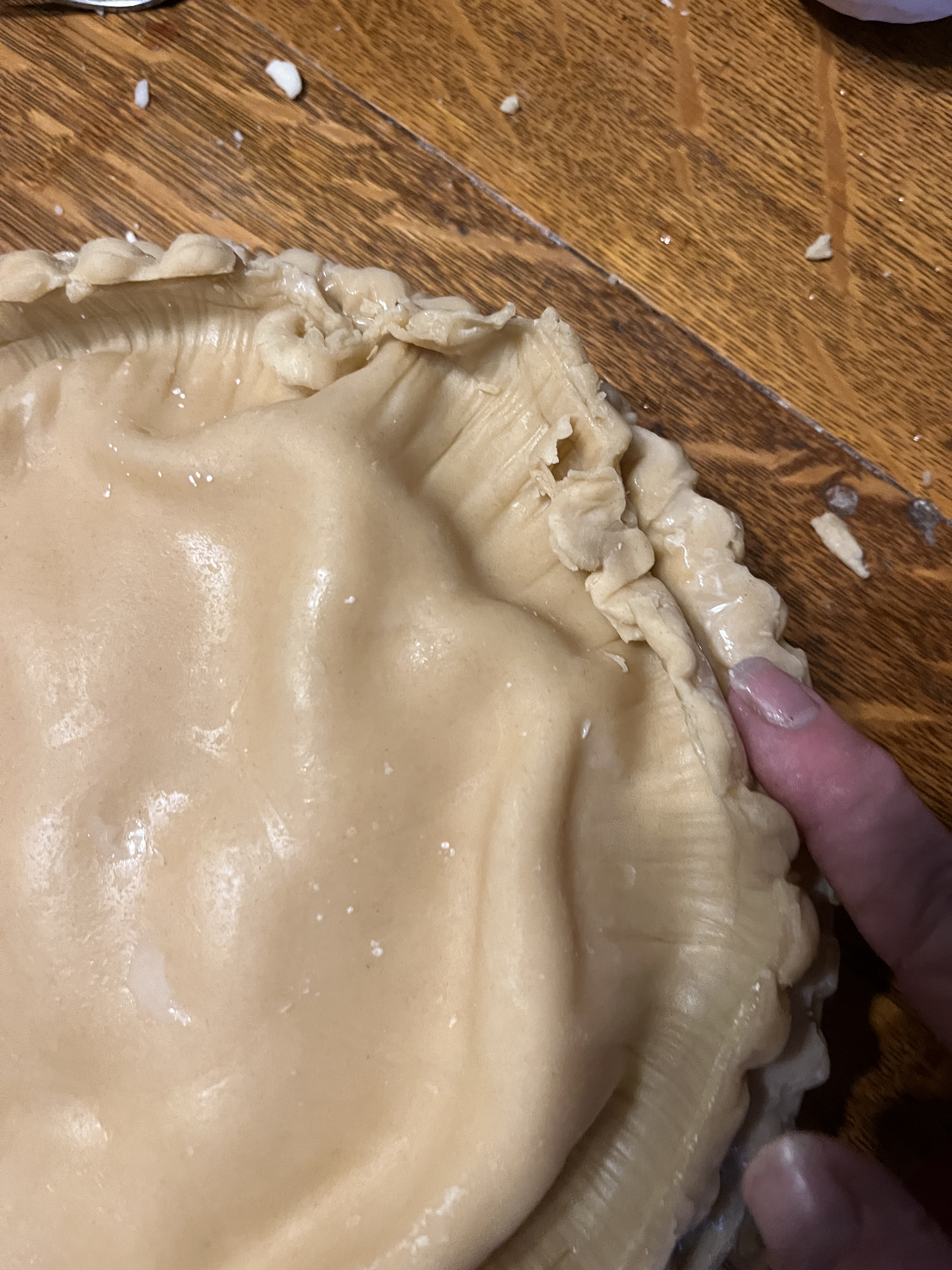 Flip the other piecrust onto the filled crust and put some water along the edge of the bottom crust. Your finger should work fine for this.