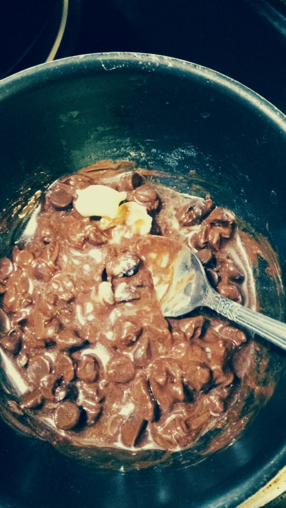 In a small pan (preferably a double boiler, but if you want to live dangerously put the small pan on the stove, turn it on for a moment, just long enough to start melting the butter and turn it off) melt: