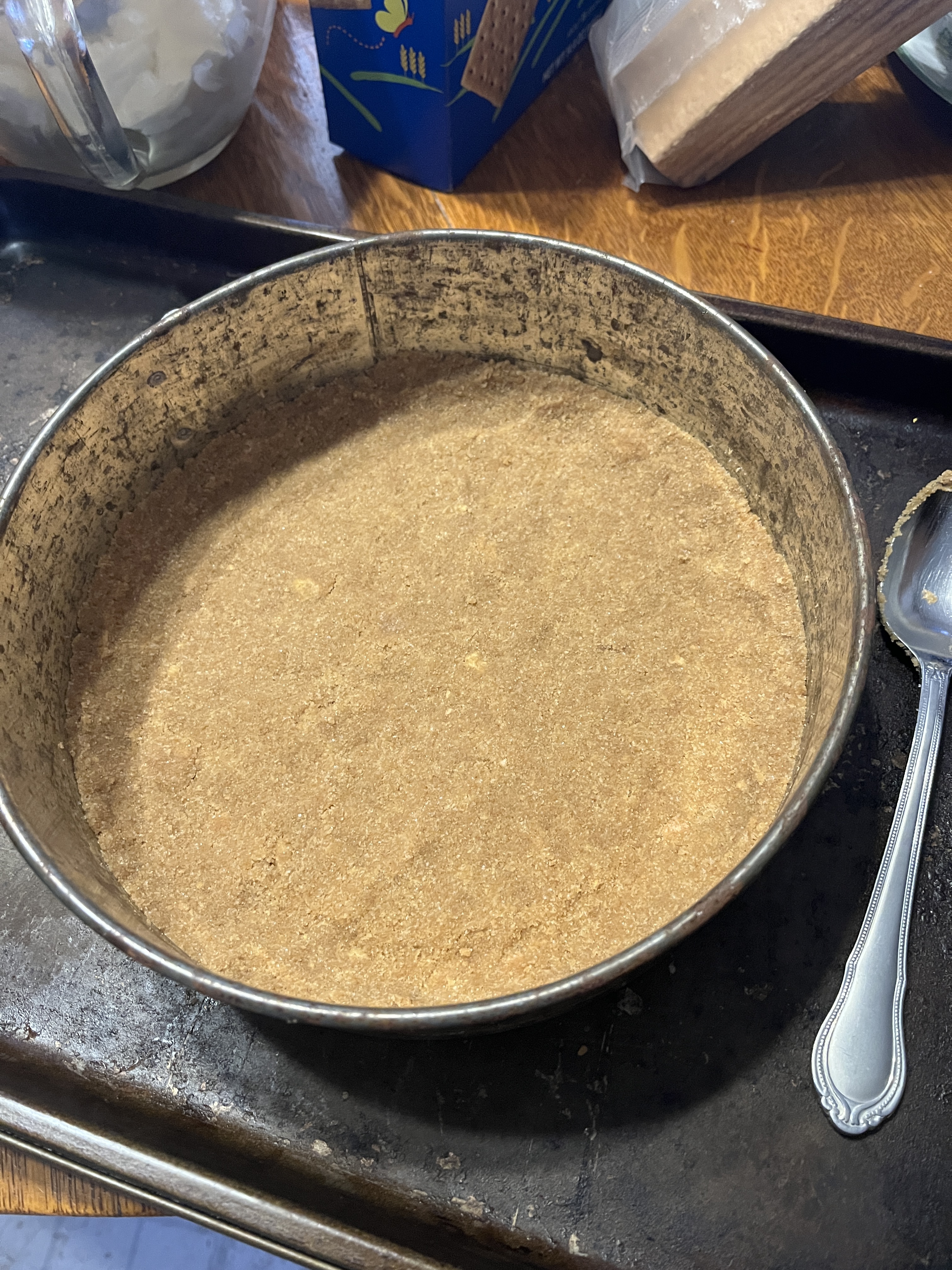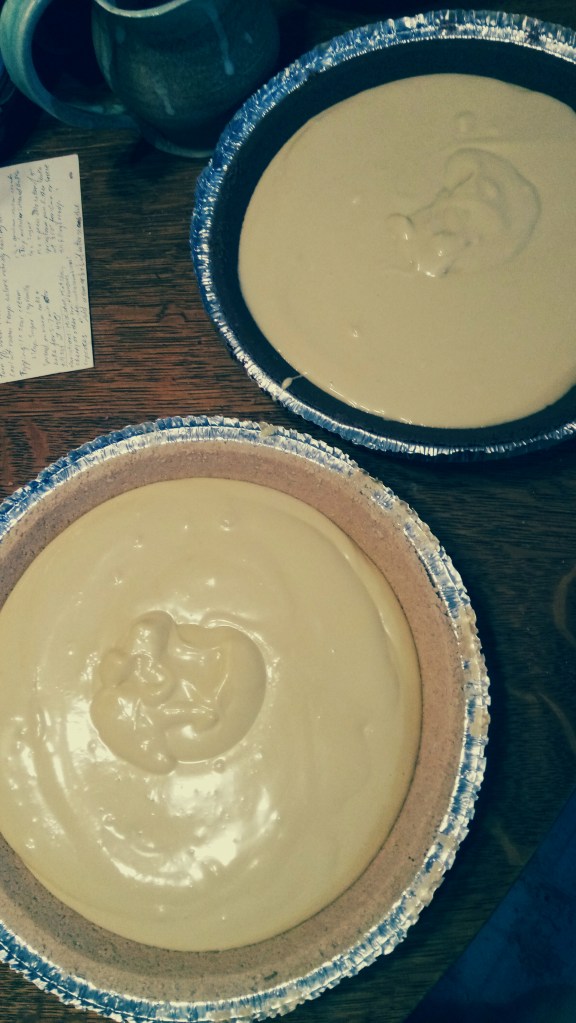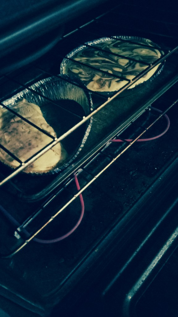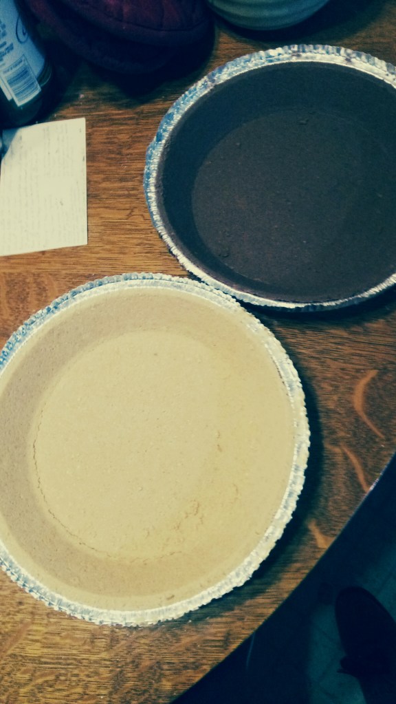 If you’re using store-bought graham cracker crusts be careful, the aluminum is flimsy! Support them from the bottom! if they buckle as you carry them across the room, bad things can happen! I probably should have put the tray next to the pie tin on the table and carried the whole tray to the oven. *sigh* Learn from my mistakes!