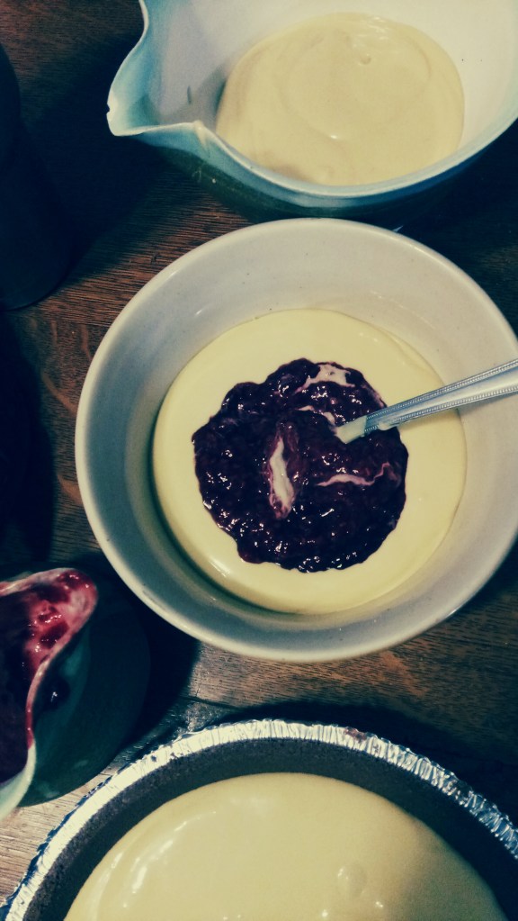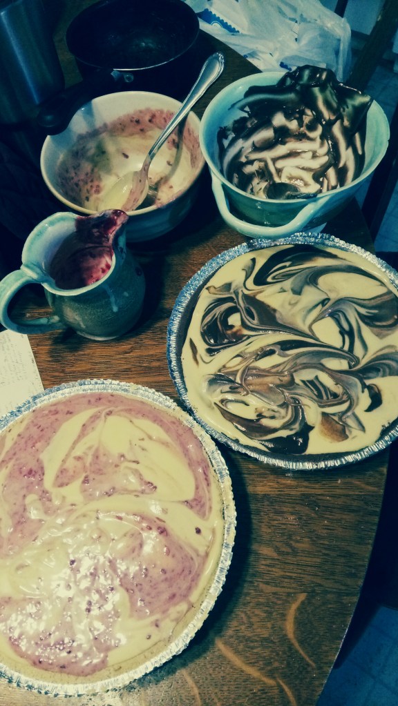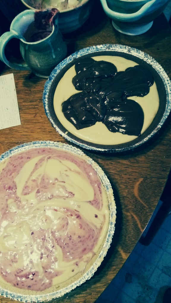 Put about 1/3 of the filling in another bowl and put the rest in the crust. If you’re using 2 store bought crusts, fill each about 2/3 full and divide the rest between 2 bowls. This way you can use 2 different flavours for swirling.