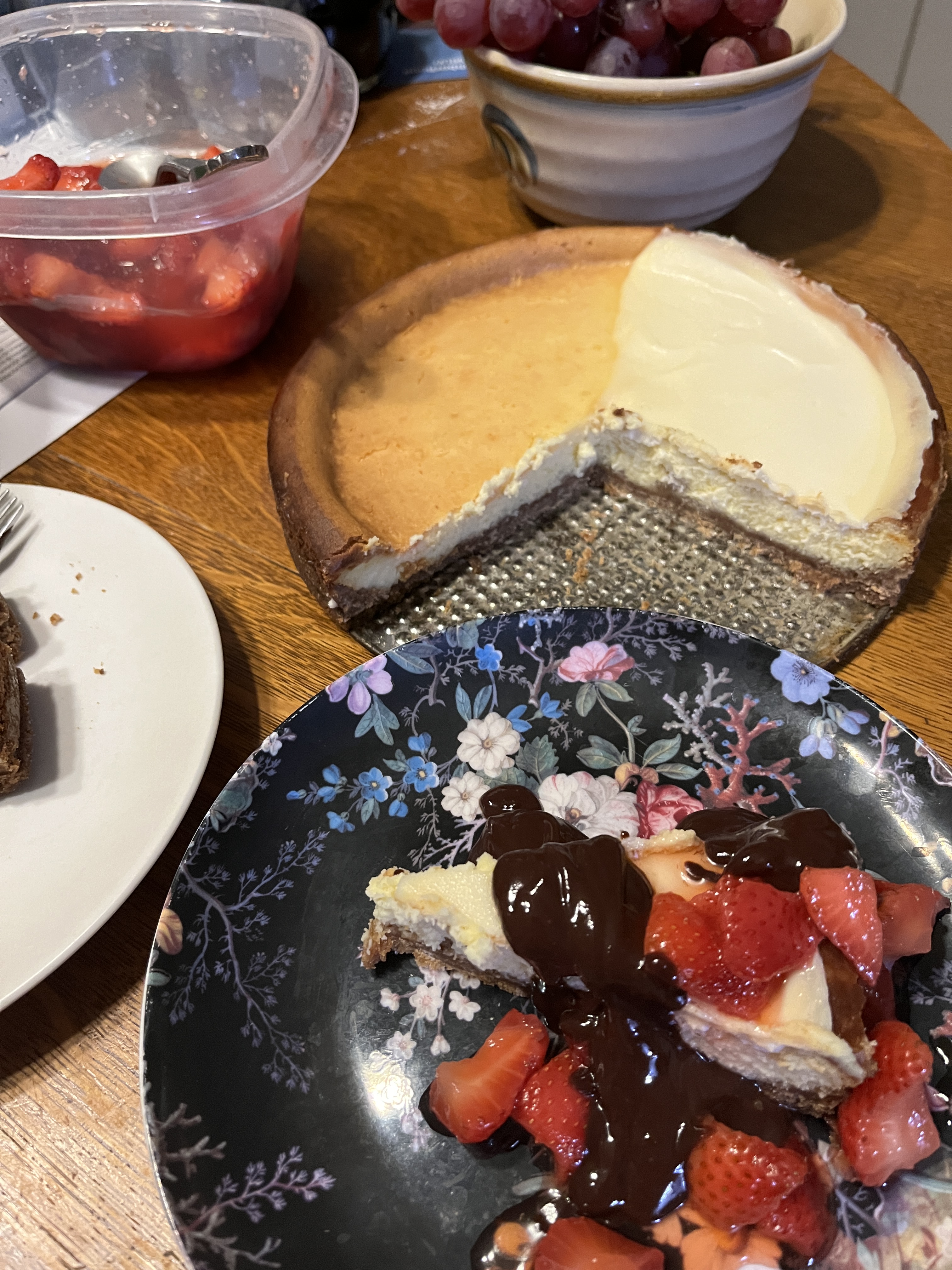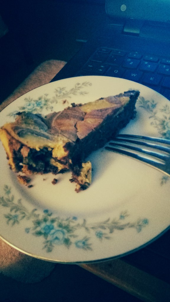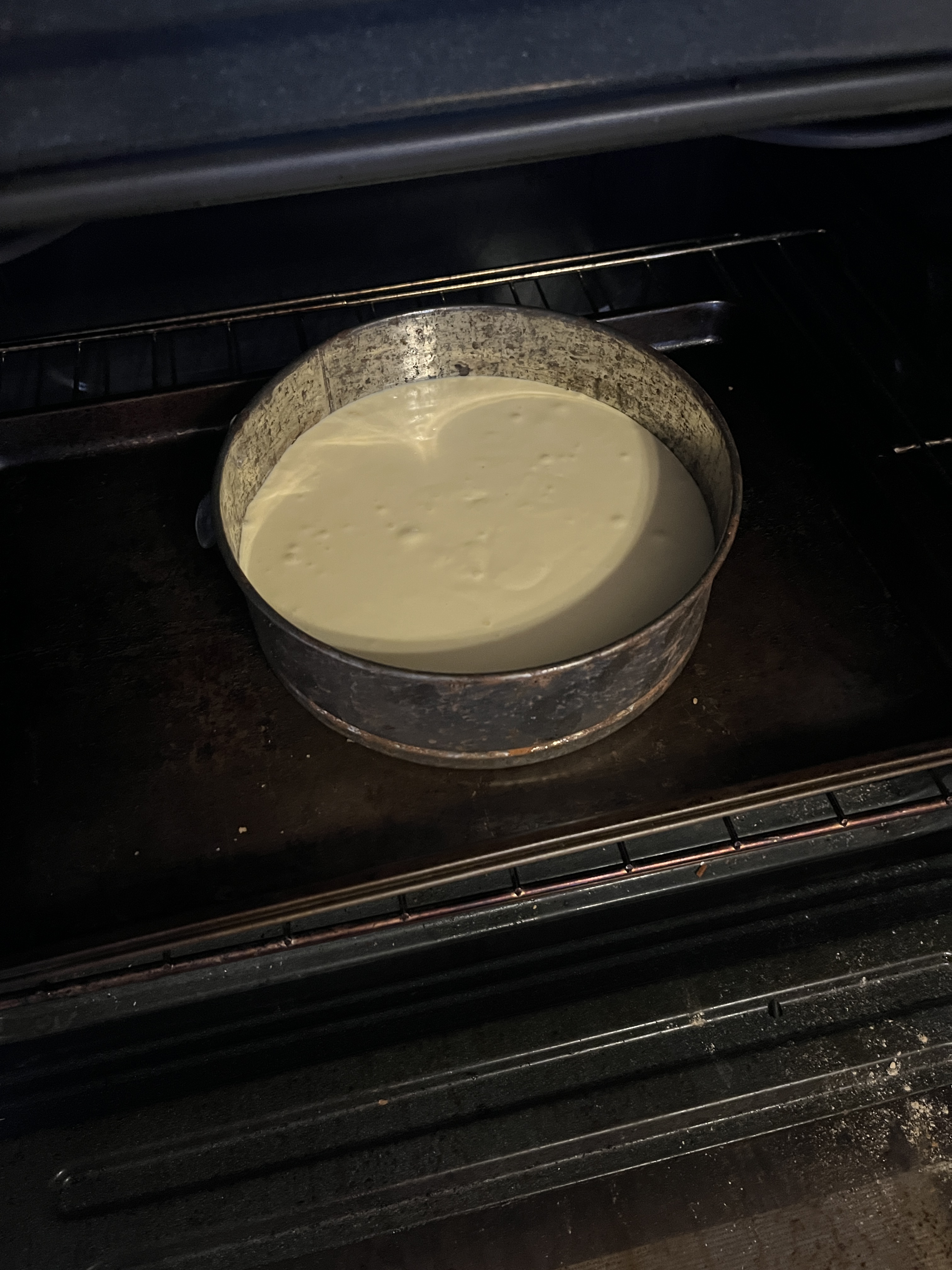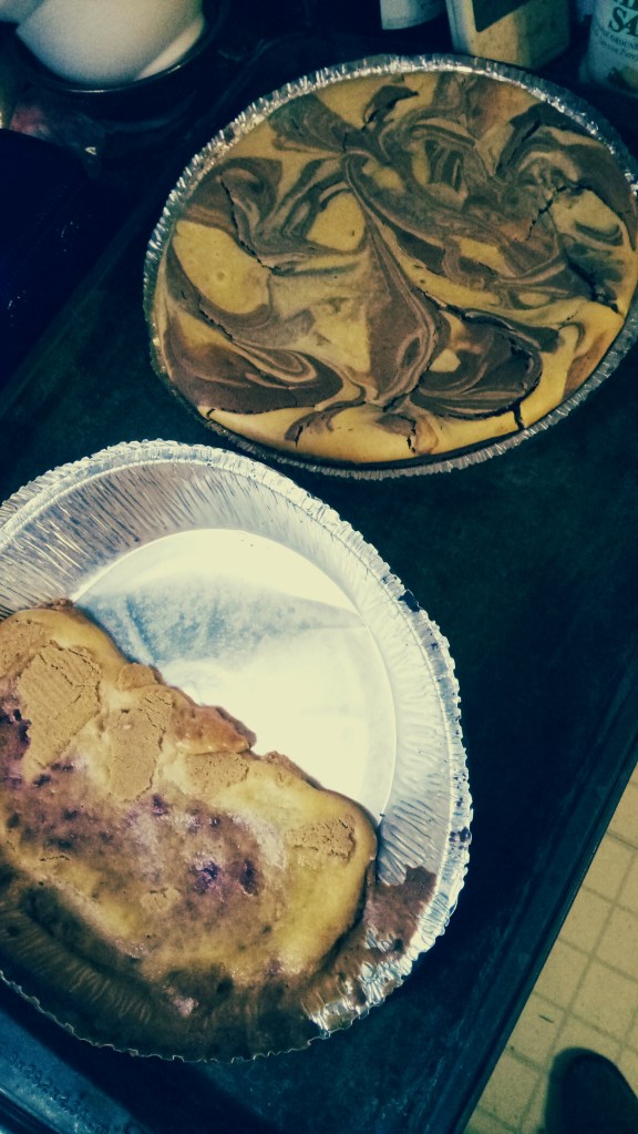 Turn off the oven and let the cheesecake cool in there for 30 minutes or so then cool at room temperature before putting in the fridge. Yes, I baked the disaster, but took it out way before the other one since it was smaller now. At least Andrew will have a couple servings even if they don’t look great. No I didn’t drop it, it just collapsed and spilled. I managed to save this much.