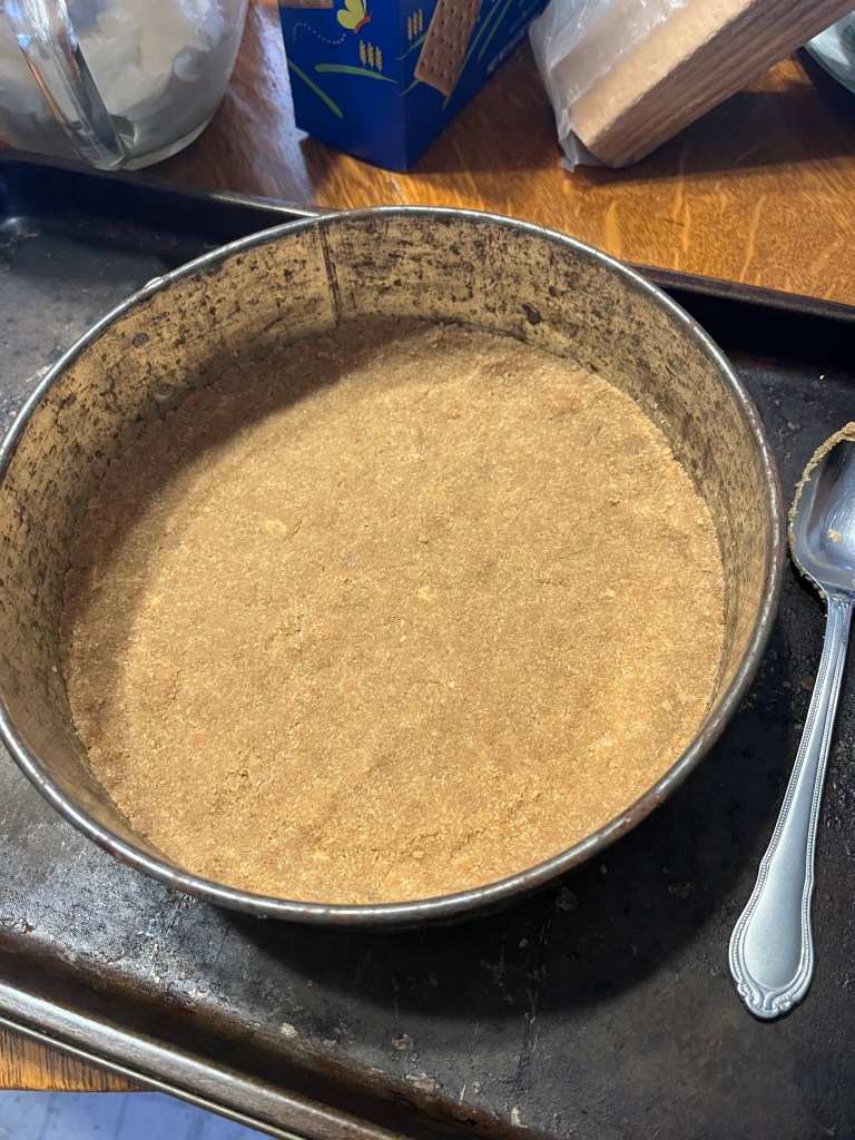 Oops, when editing months apart things happen, so go back up to the part just under the pictures of the store-bought crusts for how to make a graham cracker crust, then put the graham cracker, butter and sugar mixture into the bottom of a springform pan and press it evenly into the bottom, from the center out to the edges, making it seal the joint between the sides and the bottom of the pan.