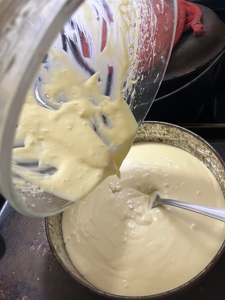 Pre-heat the oven while you mix things up. With a hand mixer mix the cream cheese and vanilla until creamy. Add the sugar and mix well. Add the eggs one at a time, mixing well then pour into it into the pan.