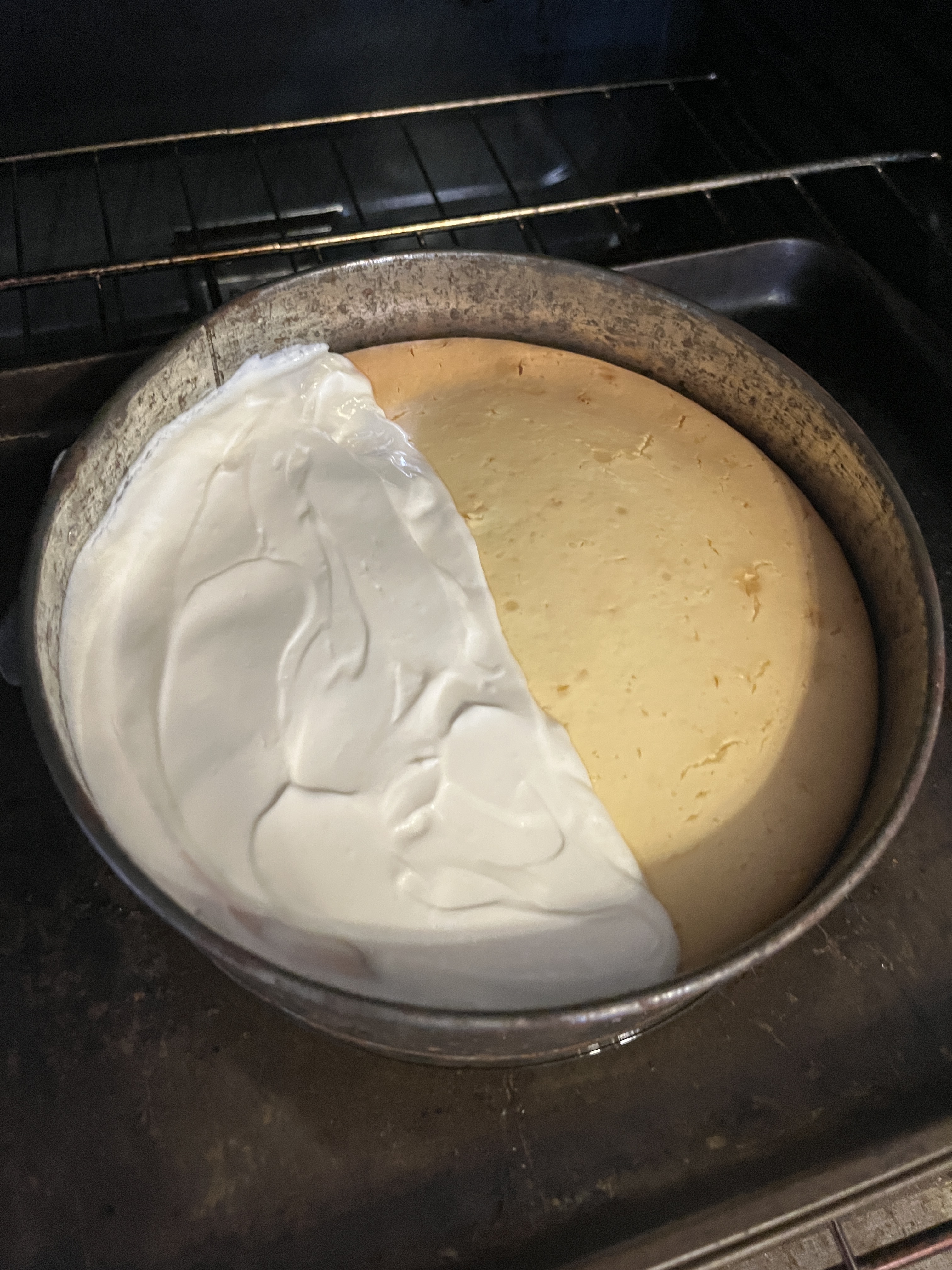 Mix well, spread on warm cake and bake at 450 for 5 to 7 minutes. My friend isn’t too keen on sour cream so I just made enough to cover 1.2 the cheesecake. I like it, if you don’t then leave it off. It’s normal for a cheesecake to crack a bit so this can hide the minor cracks. Mix it up and spread it on for the last 5 minutes or so of baking then turn off the oven and let the cheesecake cool in the oven for 30 minutes before taking it out and letting it cool compleatly.