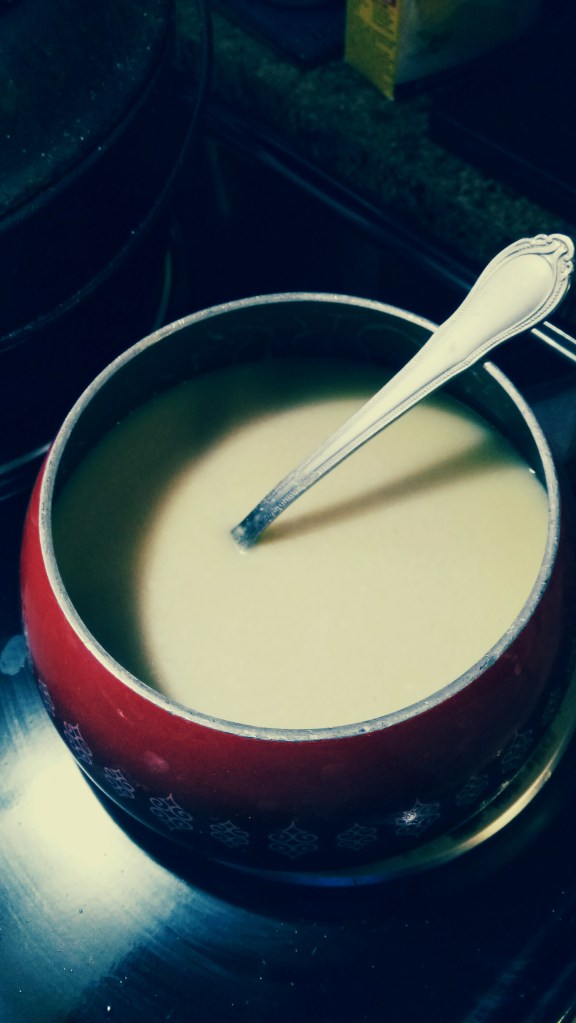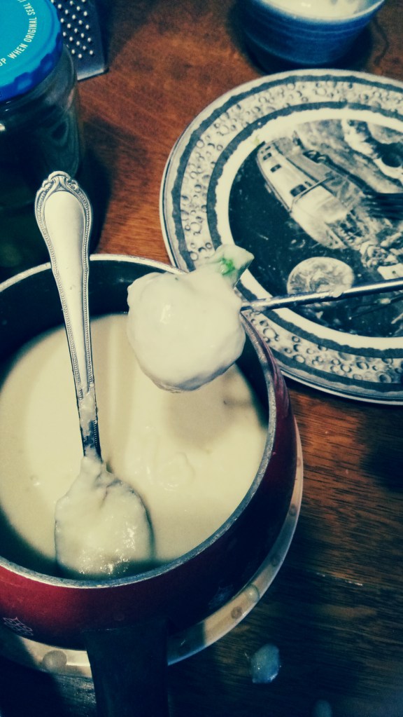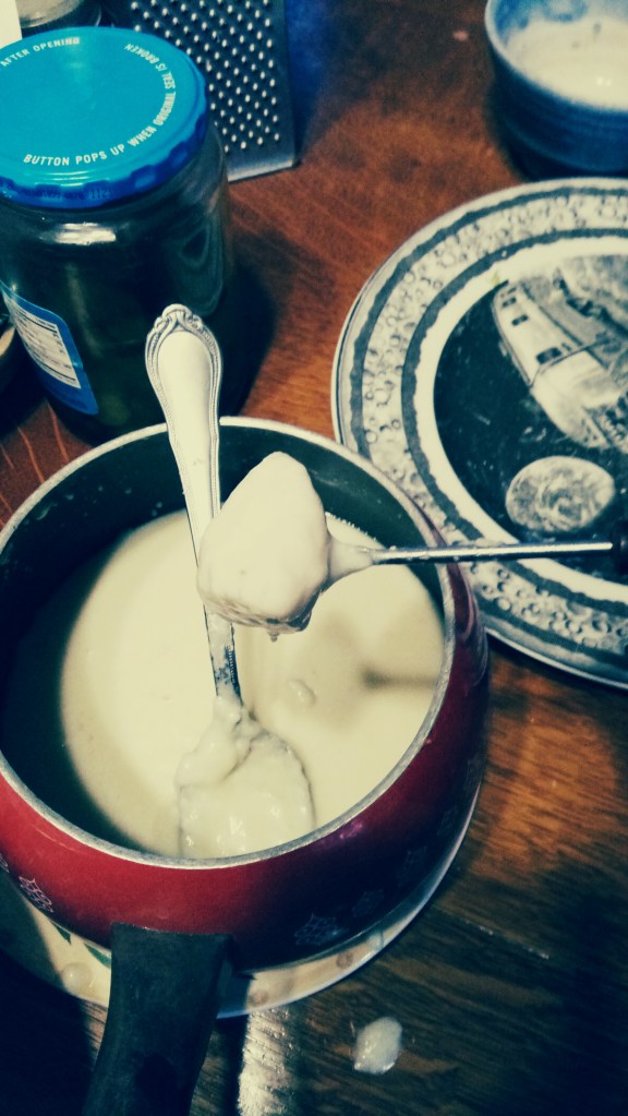 If you don’t have a fondue pot you can use a pan on the stove, but be warned, it’ll get thick on the table and you’ll have to re-melt it, which can be a bit of a pain, so if you make it and like it you might want to pick up a proper fondue pot next time you see one. If it’s decorative you can leave it on display as a conversation piece (make up an epic family story or some such acquisition story). Stories are good.