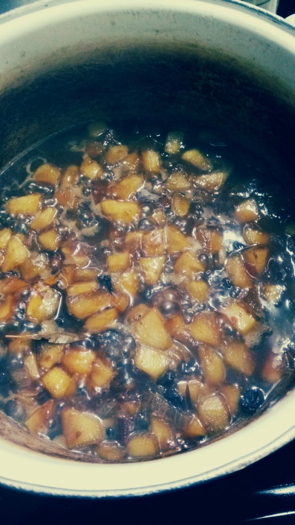 Tomorrow’s Saturday so British comedies are on at 3pm. Close enough to tea time for a ploughman’s lunch…early dinner for us. I bought some ploughman’s pickle but all the commercial chutneys had mango in them and since I don’t want to itch and take antihistamines I decided to try making a small batch myself. I looked up a few recipes. looked at the pantry and this is what I came up with for now. Next time I’ll put something different like carrot or turnip or coffee or… who knows…in it.
