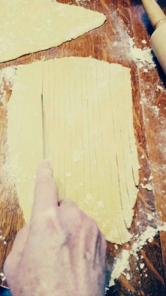 Use any available cutting implement to cut into wide-ish noodles. Set them aside.