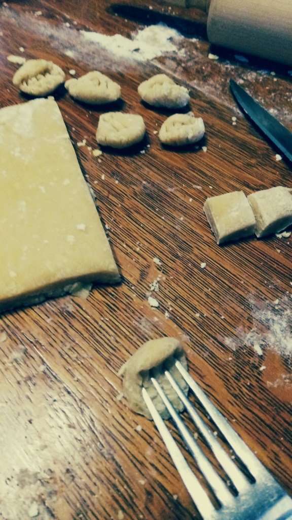 Decide to make another kind of pasta, decide on gnocchi. Don’t roll this last 1/4 any thinner. Cut into thumb-wide strips and then into knobs. Roll/squish into balls and form with a fork.