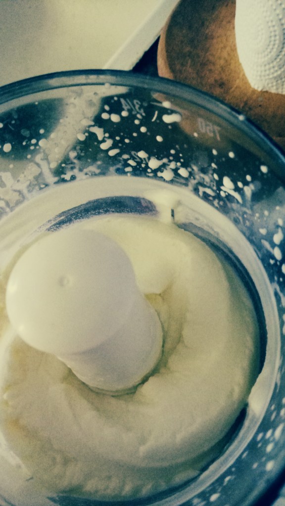 Put 1c cream into your food processor and start whizzing it up. Whizz it for many minutes. Got whipped cream? You’re on your way. Keep whizzing. I alternated between high speed and low speed. Is it finally getting smooth and you can’t see individual bubbles? Keep going.