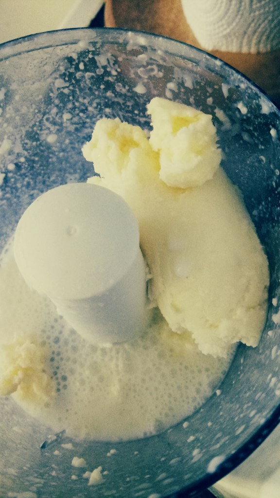 I made butter! I’ve been meaning to do this for you don’t want to know how long! Like since i was a kid. It’s in the fridge and so is the buttermilk. I’ll use that to make scones. It really is easy. I only made a small batch because I only have a small food processor, so I started with about 1c cream. If you want to make butter, use the highest fat-content cream you can find. If you have a larger food processor you can make butter from 1 pint of cream.