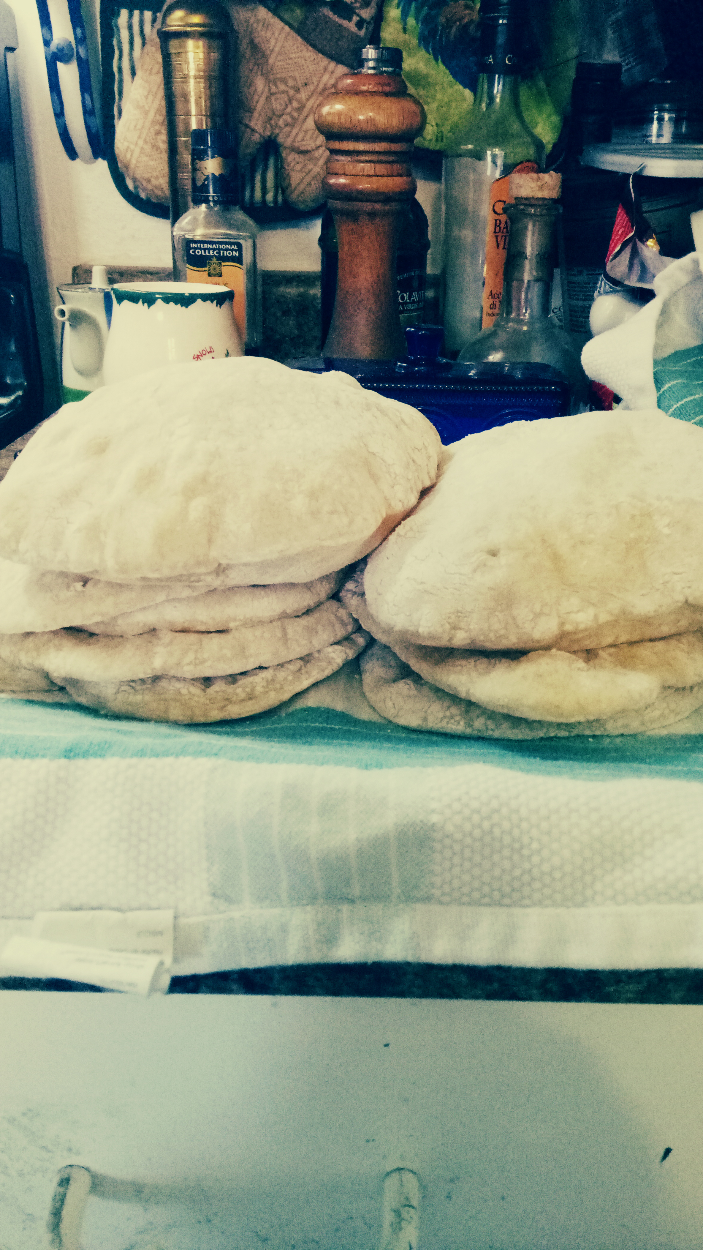 As you take each sheet out and put the next in put the baked pitas on a plate covered with a tea towel. This will help keep them soft.