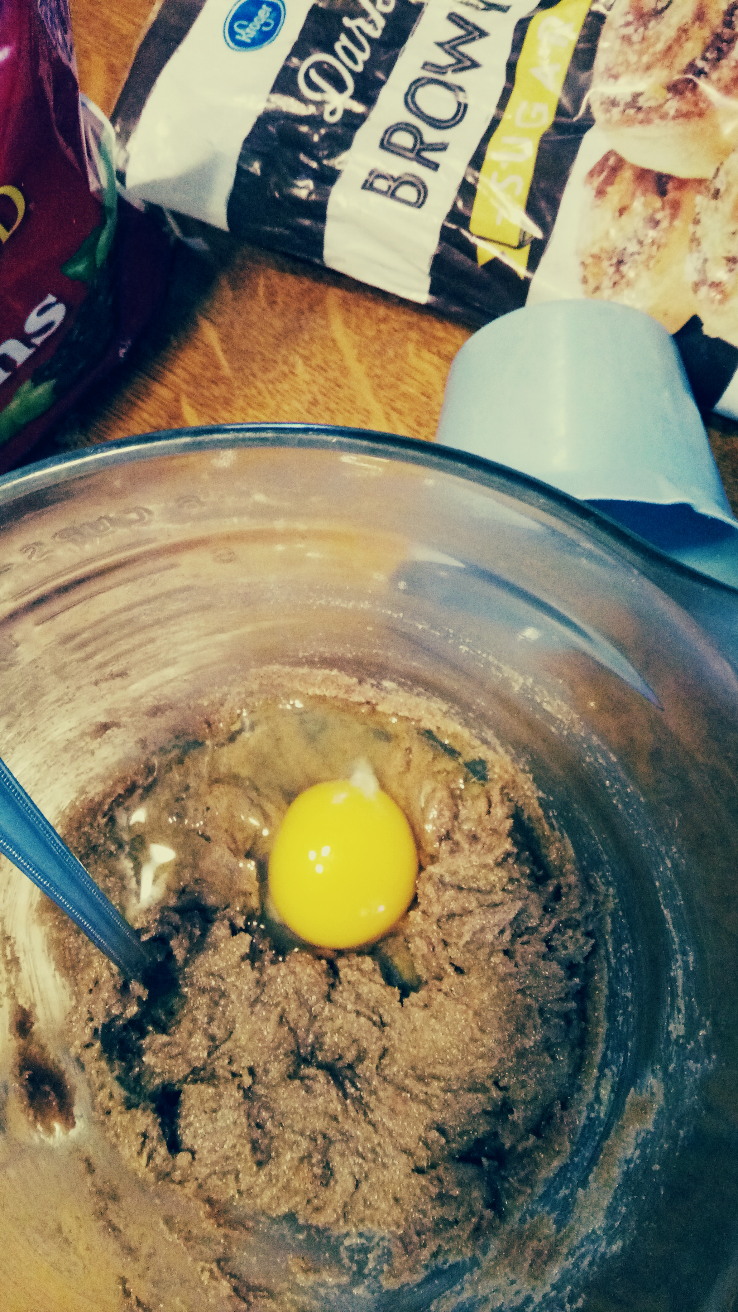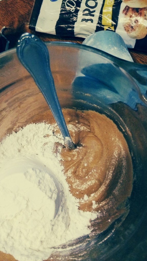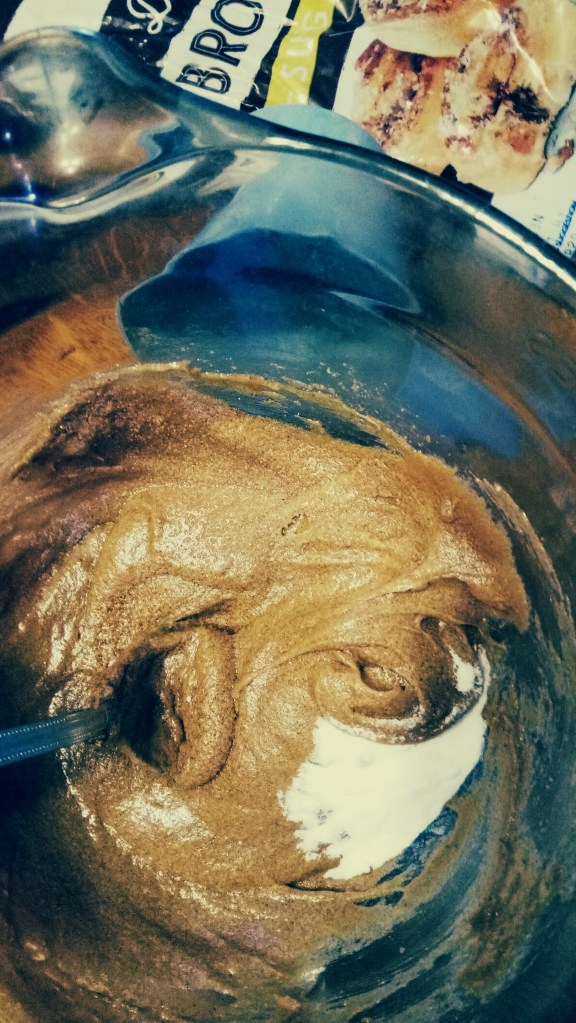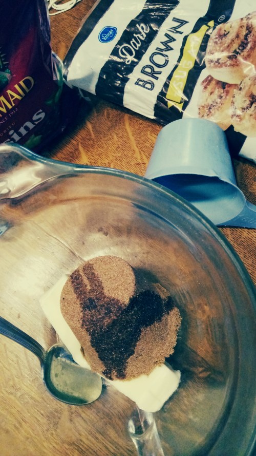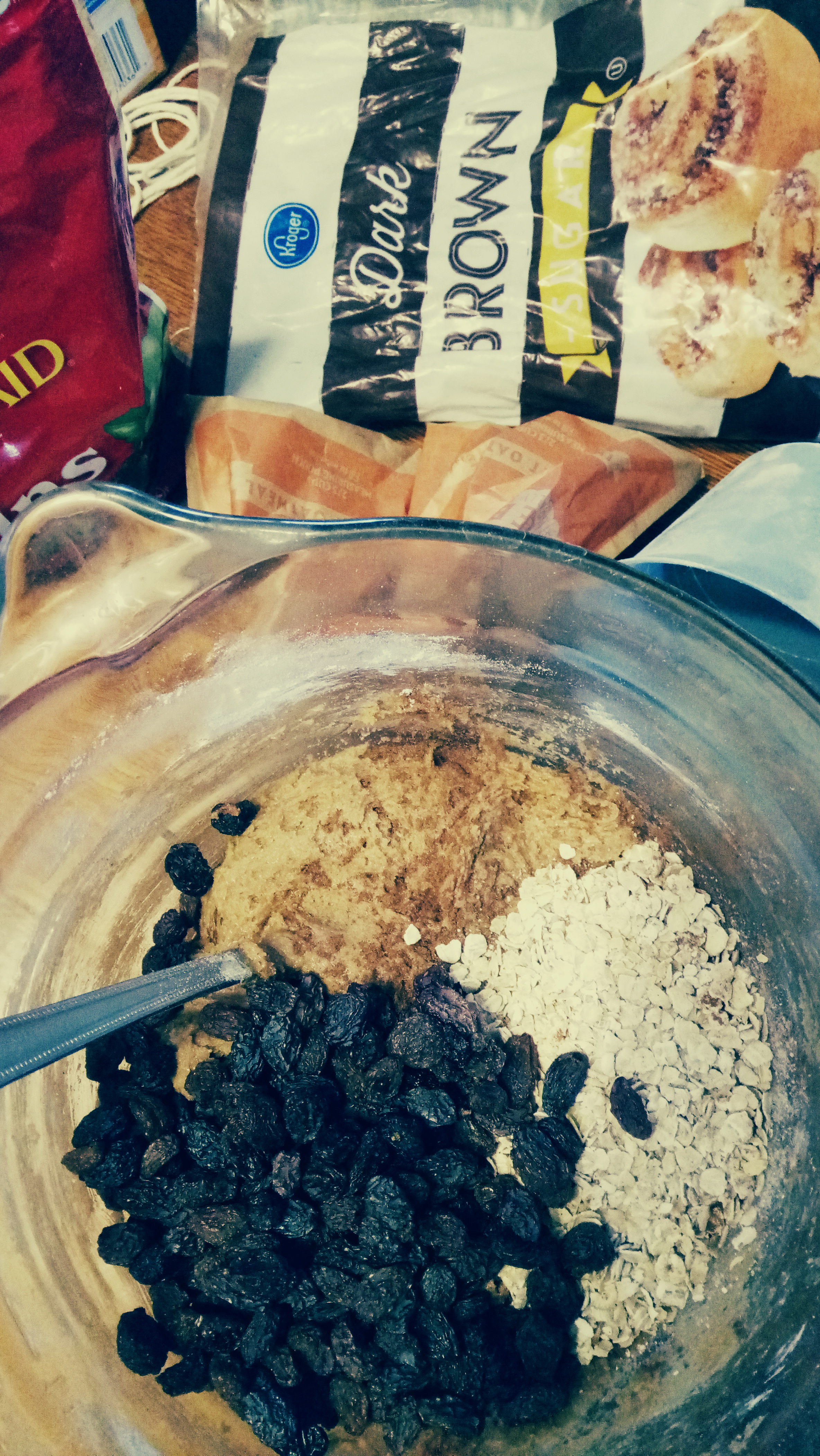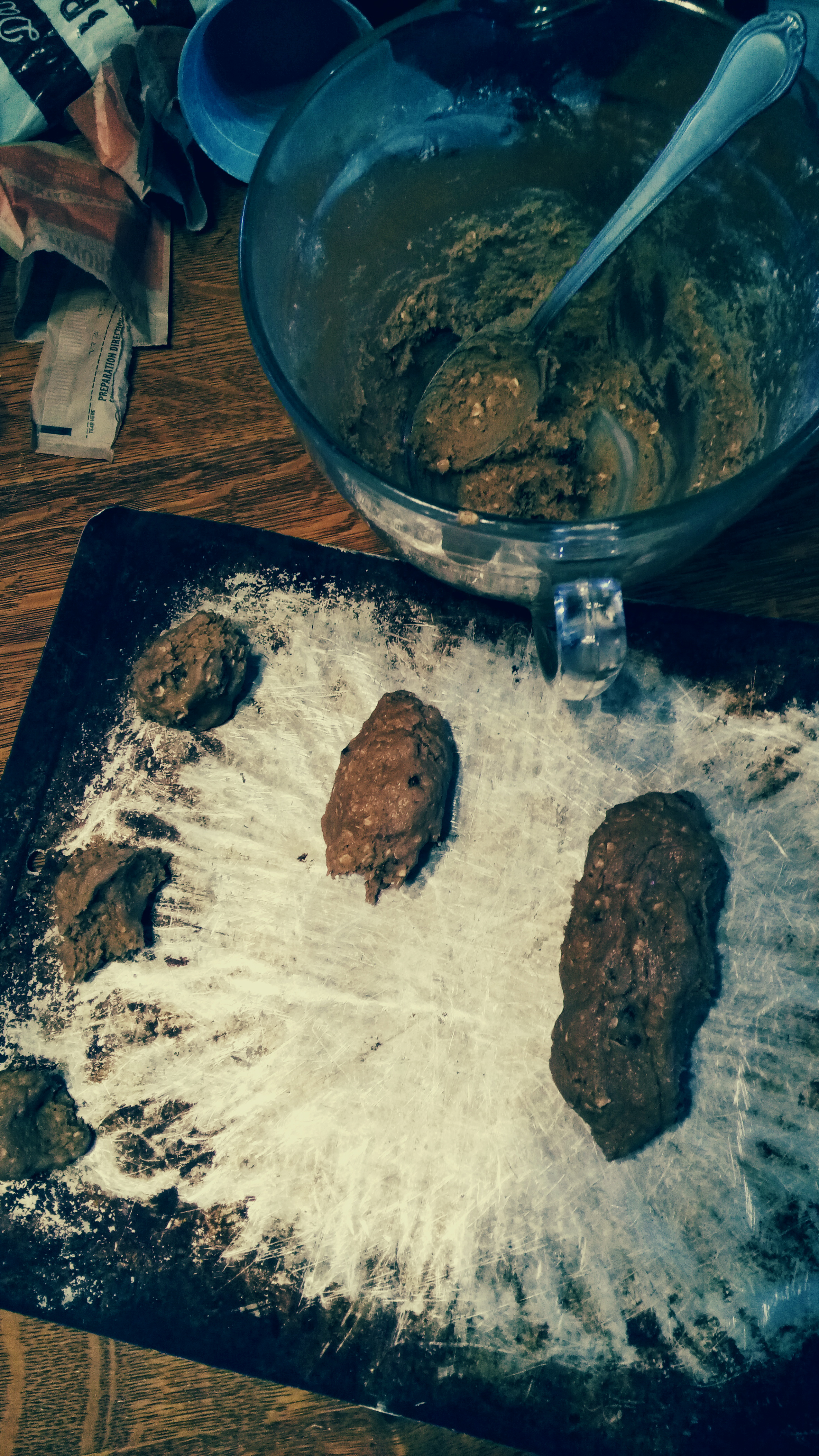 Stir in the oatmeal and raisins. This is where I realized the oatmeal packets didn’t have cinnamon in them so I added it here. It’ll be stiff but I figure I need to burn the calories before eating the cookies. This is also where, after mixing in the oats and raisins, that I realized the matrix could use a bit more stiffening so I added the 2 heaping Tbs more flour mentioned above. Next time I might add 1 more packet of oats to make it closer to 1c.