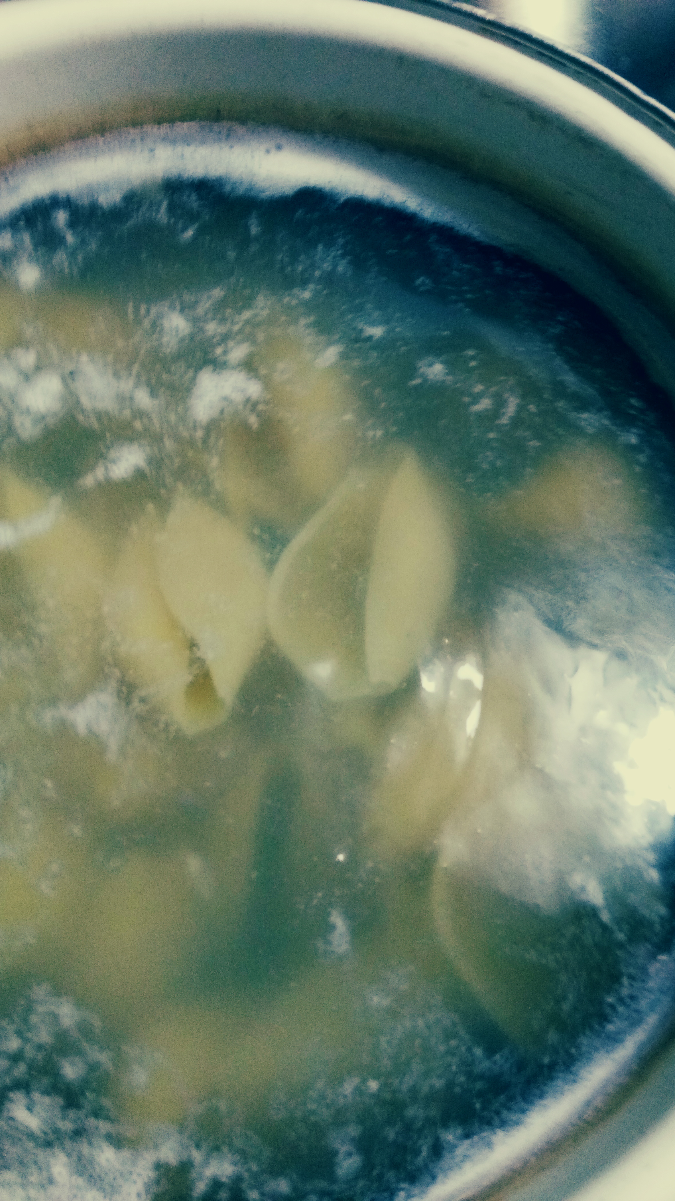Cut up the stuff to put in the filling. Garlic, an onion, broccoli, spinach, asparagus, that bit of tomato left after you put 1/2 in the salad last night and a slice on today’s salad but the last bit was too large to toss and too small to do anything else with, peas, walnuts, hazelnuts, leftover pork, chicken, beef, meatloaf or whatever’s handy. If you want to sauté the onions, celery, mushrooms and meat (don’t forget to deglaze the pan with wine) before putting the shells on to boil, now would be a good time to do it, then they can be cooling while the shells are cooking.