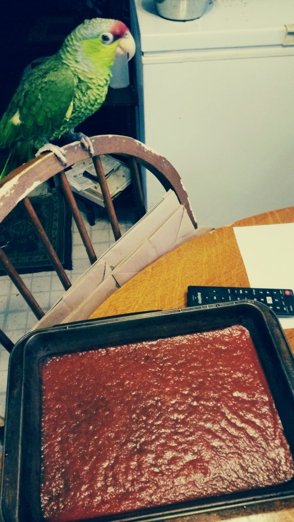 Pour some spaghetti sauce in the bottom of the pan (or both if your bird flies away from the cat and lands in the bigger pan you were expecting to use). Of course you made your own from home-grown ingredients, but if you must go ahead and use a canned or jarred variety, which you always have in the cupboard for emergencies. A can and a half should do, unless you just don’t want yet another leftover in the fridge, then go ahead and dump it all on. If there’s any left in the pan after serving you can always make a pizza for lunch tomorrow. Oh, pay no attention to the chipped and chewed char. Paco used to be a very picky eater and “Don’t eat the furniture!” was frequently heard for some years. Now he’s better behaved.