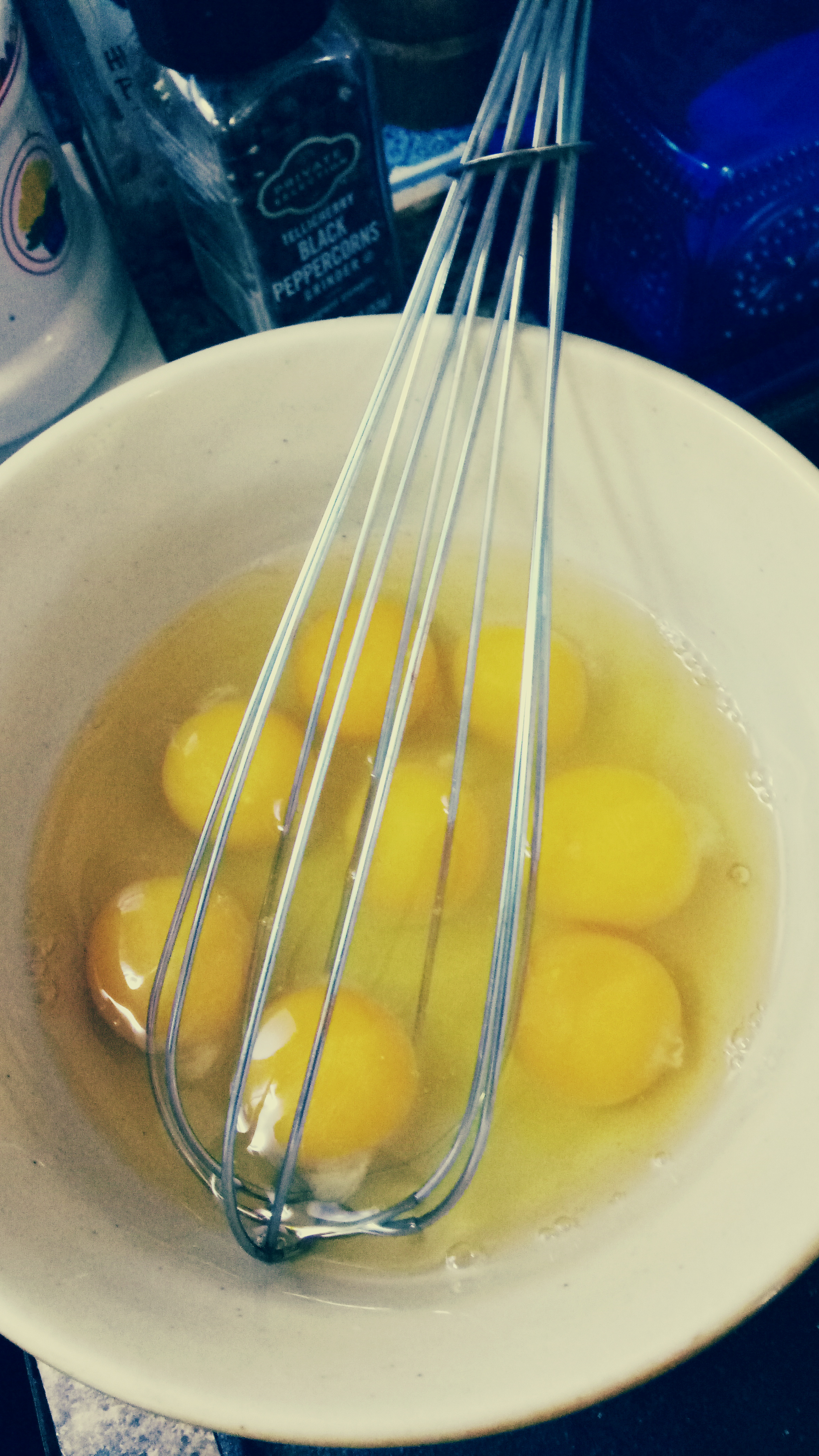 While that’s warming, crack eggs into a bowl and whisk well until light yellow and fluffy. This time I used a regular whisk. Next time I’ll use a hand mixer and also add at least 1/2 the sugar to the eggs to help break them up.