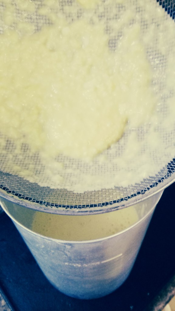 Pour it into the ice cream freezer through a sieve. No matter how perfectly you cook the custard there will be a few lumps. I goofed and there were a lot of lumps this time. I let it start to boil and it curdled. I’ll do better next time. Sh! Don’t tell! It turned out OK in the end. Put this in the fridge to cool while you run out for ice or send someone out for ice so you can start dinner.
