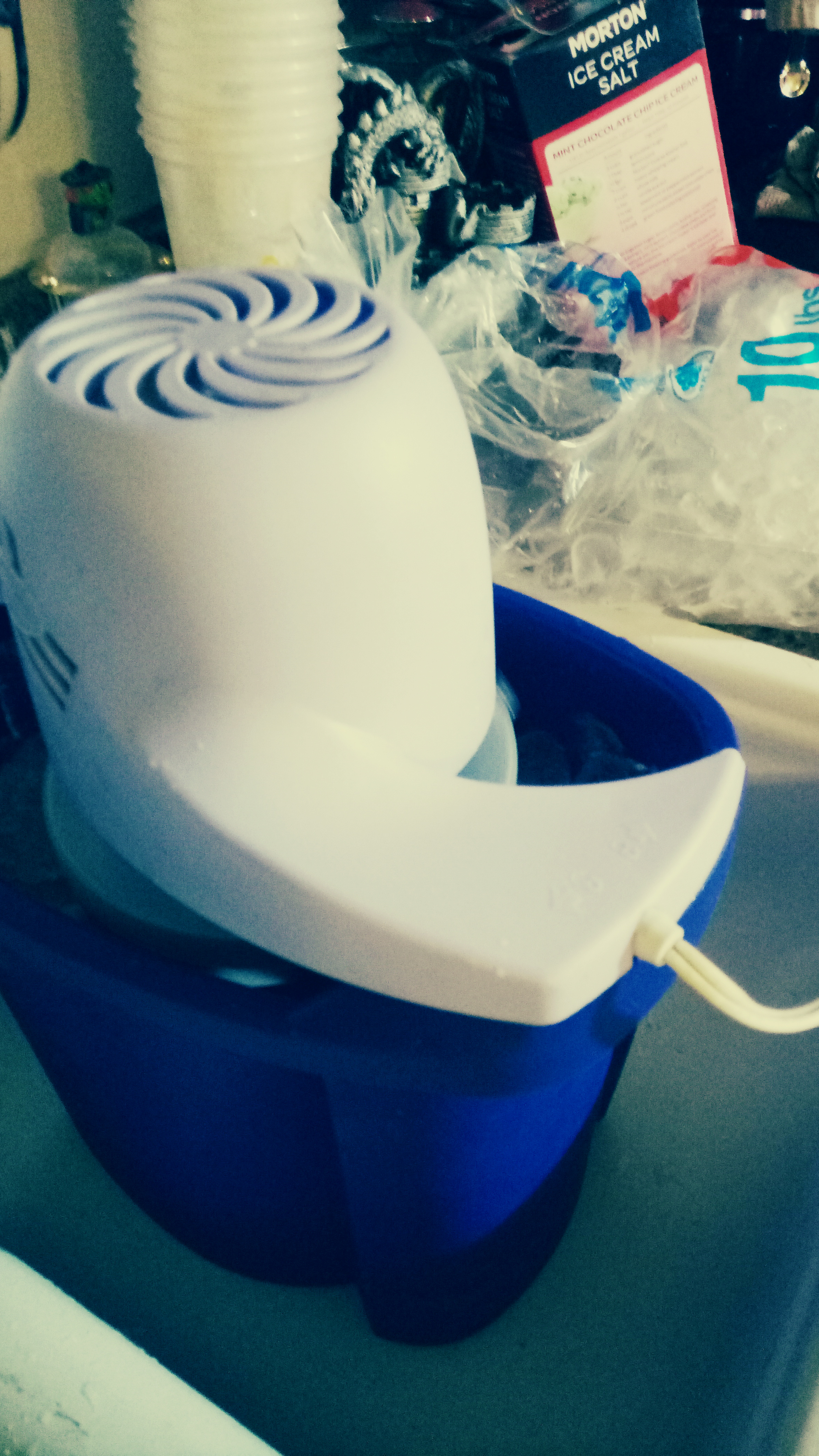 Figure out how to get the top machine on the top of the dasher and affixed to the top of the outside body of the freezer. You have to hold your tongue just right as you bend your head upside down to see how the top of the container fits into the machine part, but you can do it! YAY! Done. now add a good layer of crushed ice, a layer of salt, another layer of ice, a layer of salt and do this til it’s full between the ice cream container and the outside housing. Keep the bag of ice in a bowl so it doesn’t flood the counter or table as it melts or, better yet, do this outside so it can water the grass or flowers and the noise doesn’t matter so much. Plug it in and wait. Add more ice and salt as the ice melts down. In about 30 minutes or so you’ll have ice cream. DO NOT TOSS THIS MELT-WATER AND ICE ON THE GRASS!!! THE SALT IS BAD FOR THE GRASS AND WILL ANNOY YOUR PARENTS!