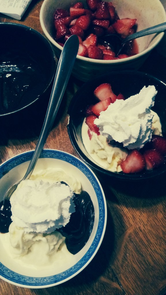 Adults can have 2 scoops in bowls with toppings. Somewhere in this blog I have recipes for easy strawberry syrup topping and chocolate fudge sauce. Bananas are good too, as is whipped cream (we cheated with the frozen canned kind. It makes a fun, fancy top). Cherries are nice on top, too. Sprinkles. Chocolate shavings. crushed cookies. Nuts. The options are almost endless.