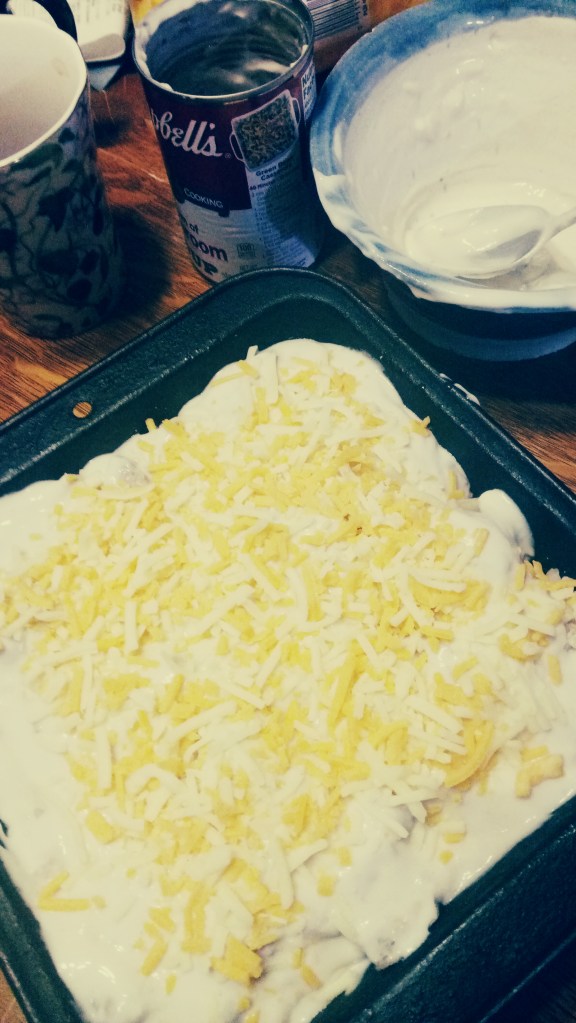 In a bowl mix a can of cream of mushroom soup with about a third of a can of milk to loosen it up and pour over the chopped stuff. Top with grated cheese.