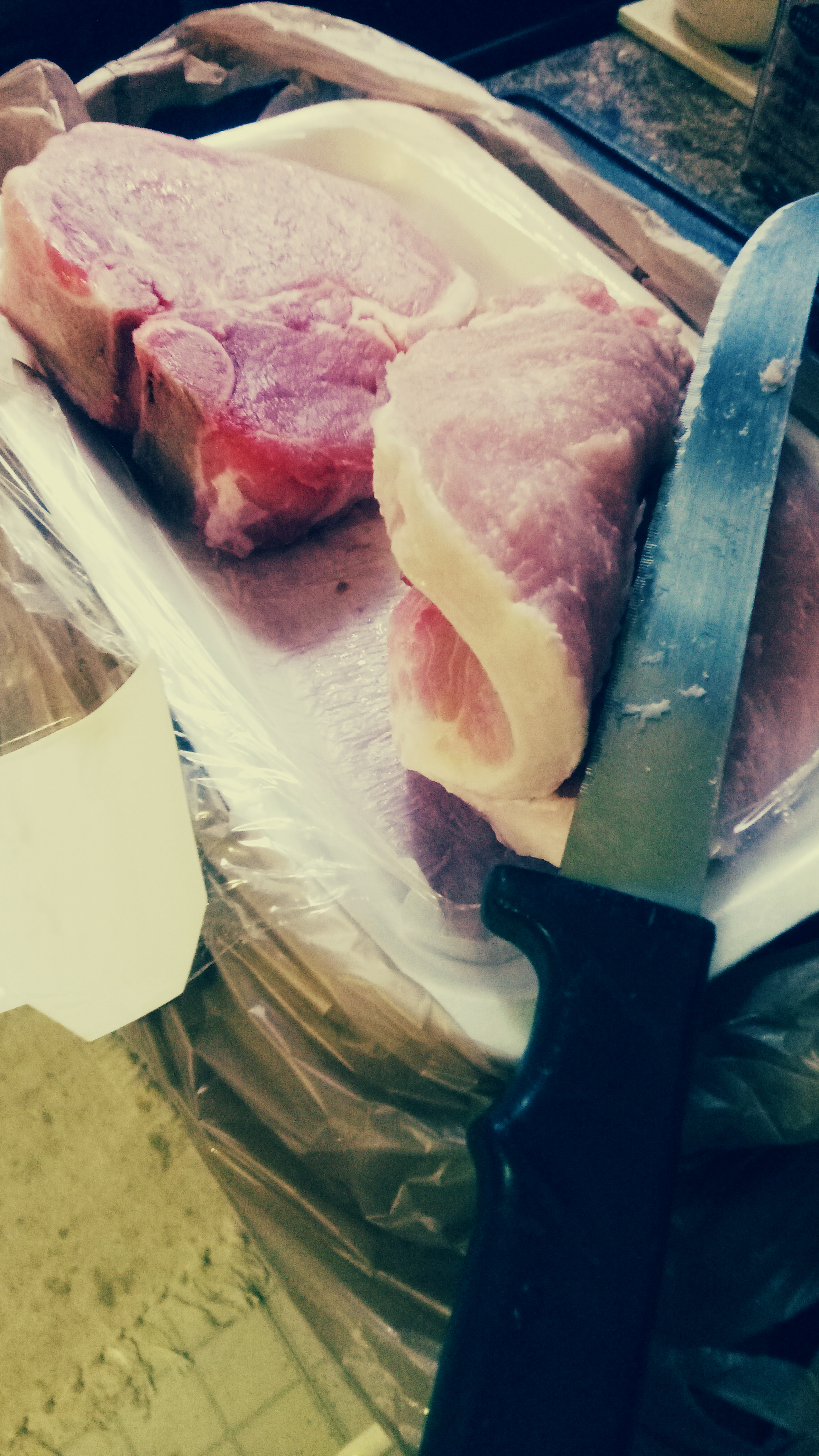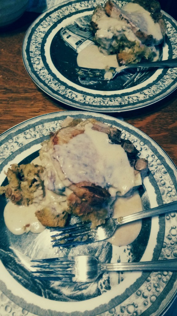 I popped by the store for a quick something and cauliflower was on sale so I bought some and fresh potatoes and updated that post (cauliflower pie). As I passed the meat counter I noticed pork chops for sale. Thick pork shops. Thick enough for stuffing. I had 1/2 a loaf of bread to get rid of so now I had plans for dinner. So here’s another blog post.