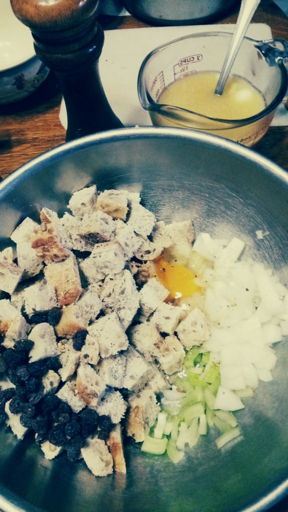 Throw the stuffing together. Cut up a stalk of celery, half an onion and half a loaf of yummy bread. Break in an egg, grind on some fresh pepper and melt 4 oz (1/2 a stick) of butter in a cup of broth with a good dash of Worcestershire sauce. A few raisins add a nice sweetness that goes well with pork, but you can leave them out. The egg is optional.