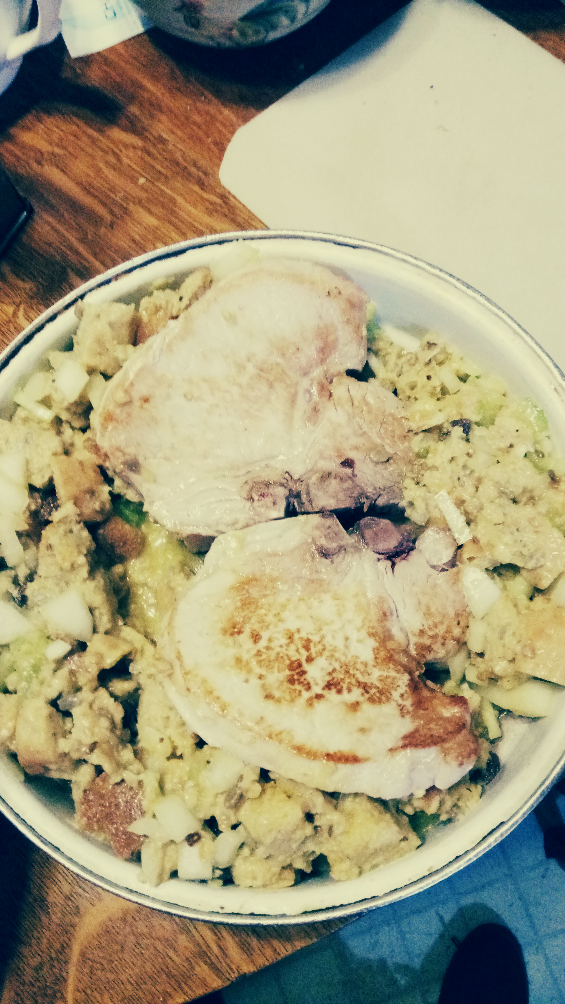 Make some gravy. I used milk because I forgot to save some broth before I froze it. A couple dashes of Worcestershire sauce makes it not taste like what you put on biscuits in the morning and goes great with the pork as well as the stuffing.